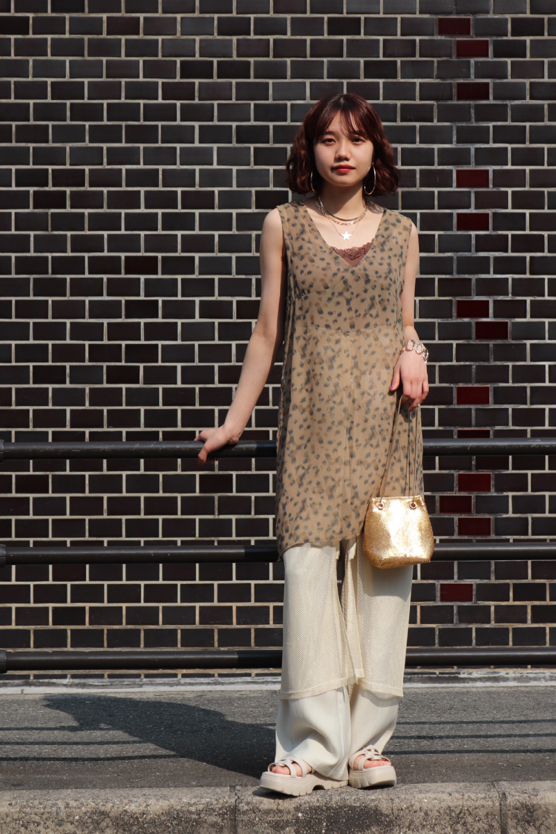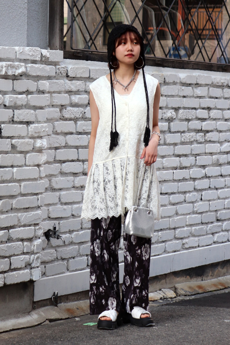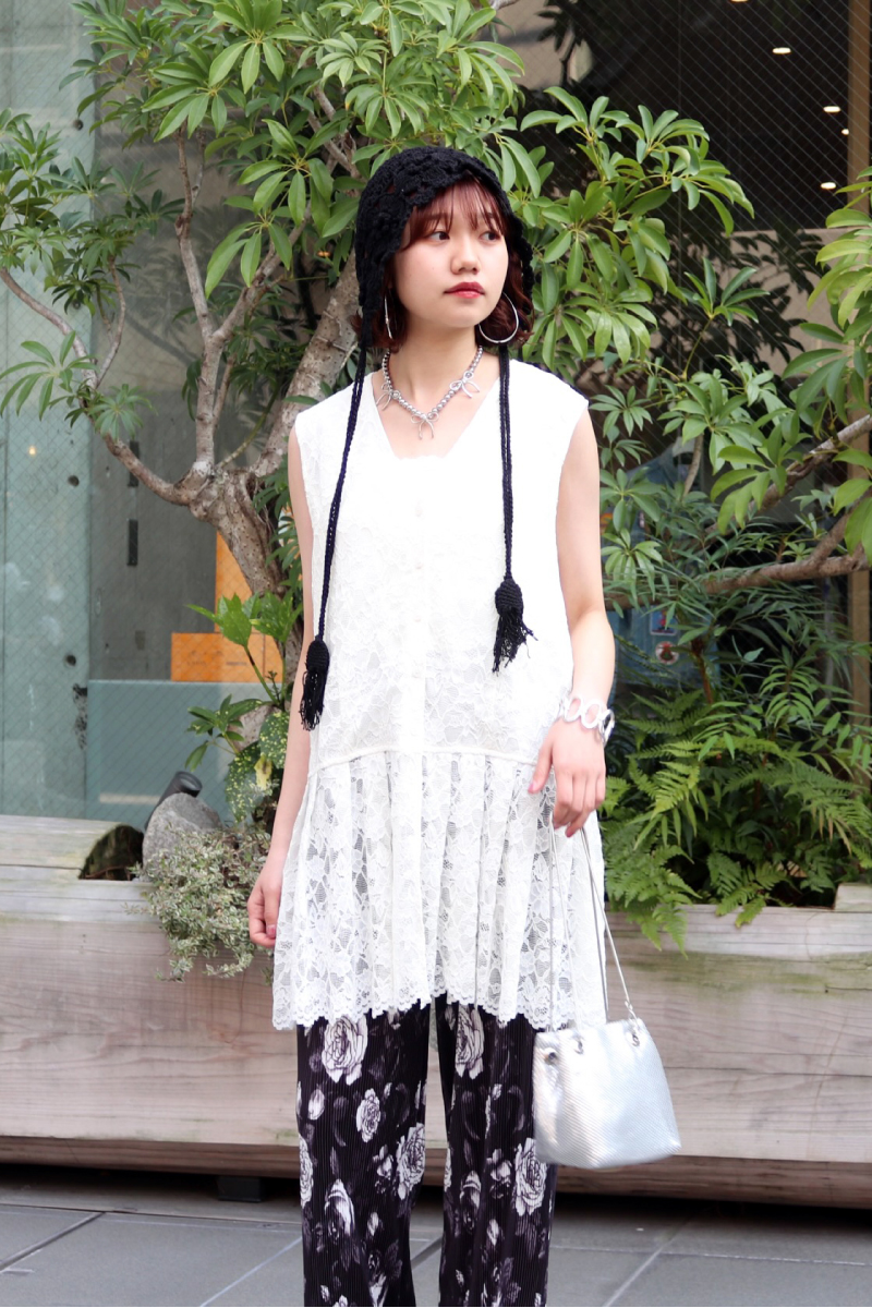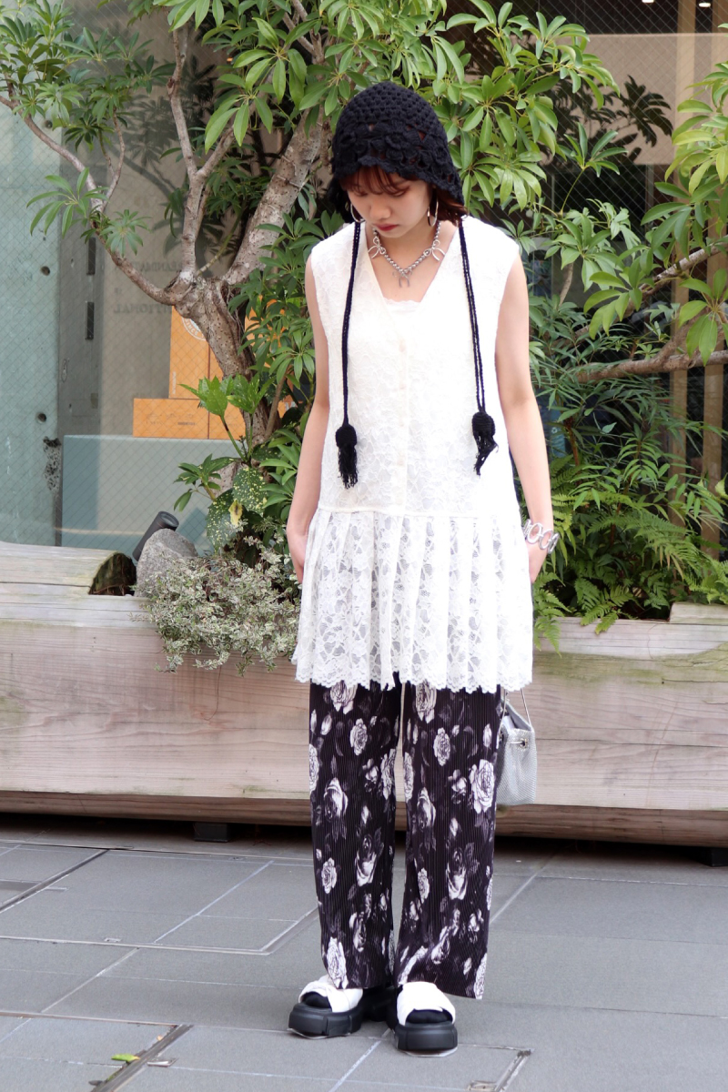 STYLING POINT総レースやプリーツの糖度高めのブラウスはVネックxノースリーブでスッキリとした印象に。ヴィンテージライクなパンツと相まって可愛いにもキレイにも運べるコーデ。小物で表情に変化をつけても◎
