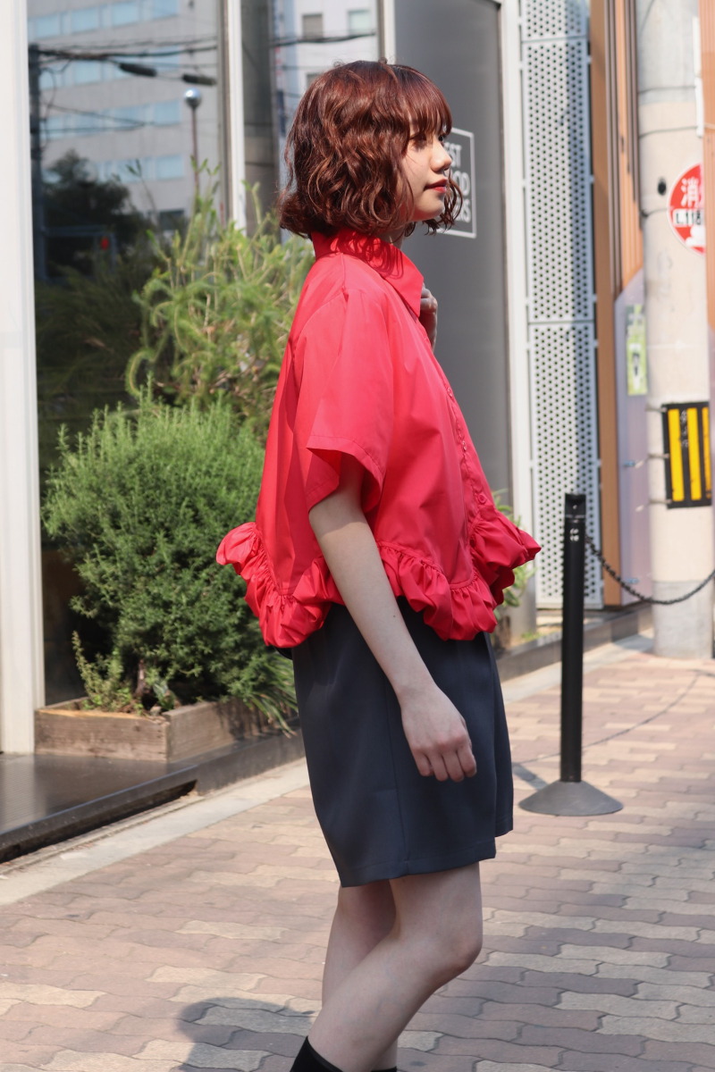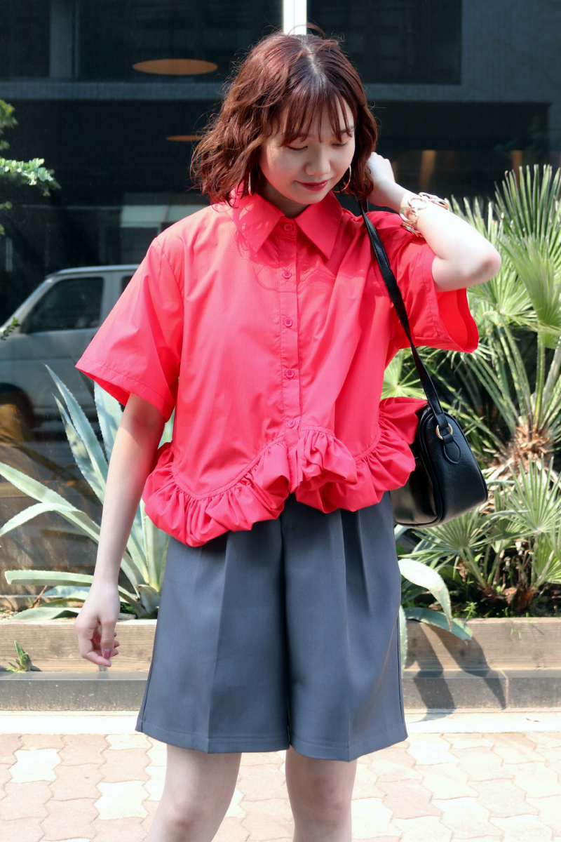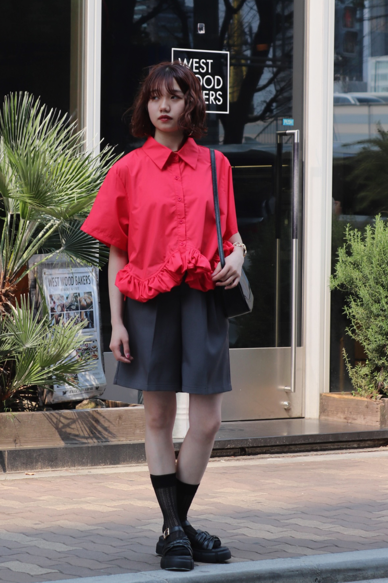 STYLING POINTレディに導く「赤」。デザインシャツの色を赤にするとさらに魅力が増して感度が上がります。なじませ役を担ってくれるグレーを合わせると柔和さが加わって鮮度も抜群です。