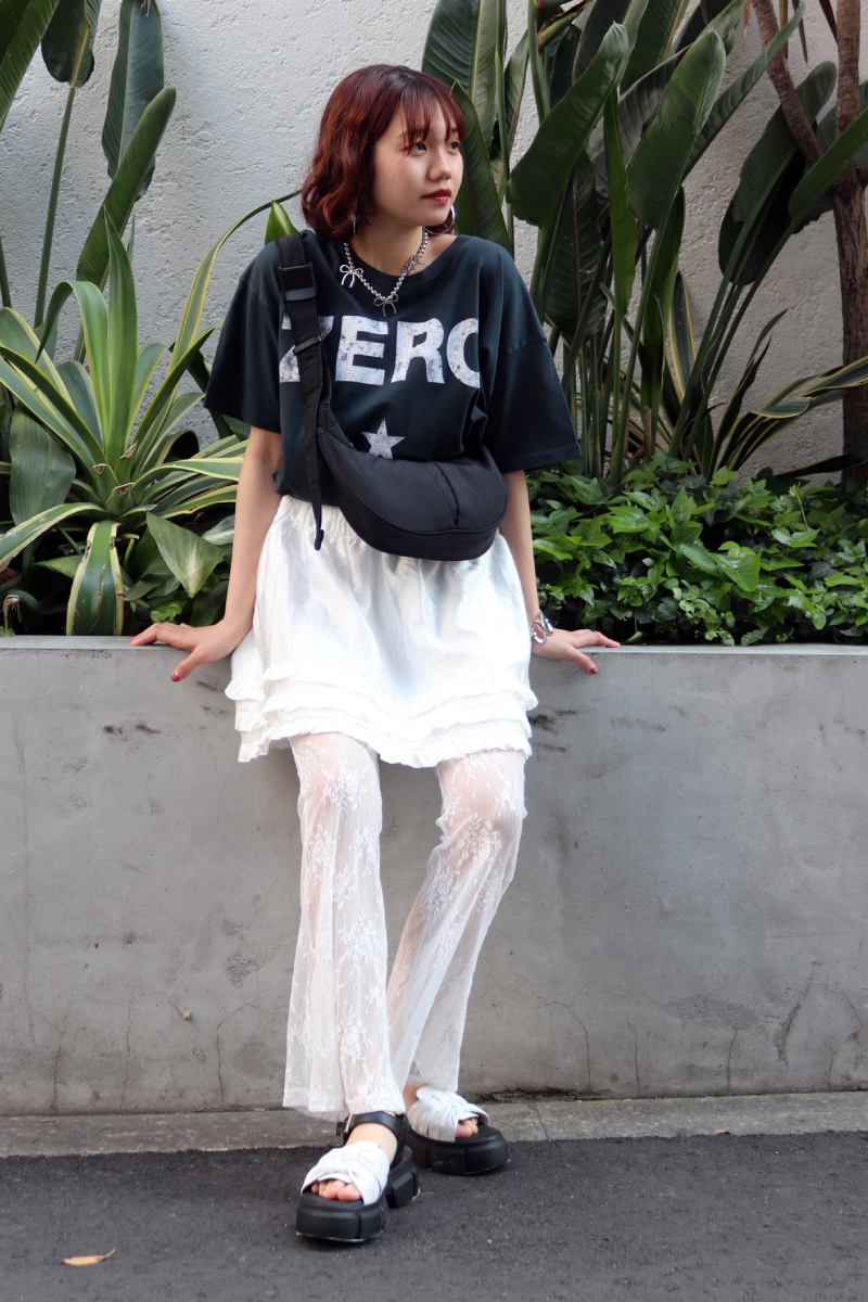 STYLING POINTレイヤードするひと手間でオシャレ度をUP!定番アイテムのTシャツと合わせることで大胆なレースの特別感が和らぎます。ミニボトムはレースと同色にしてセットのように着るのもおススメ。