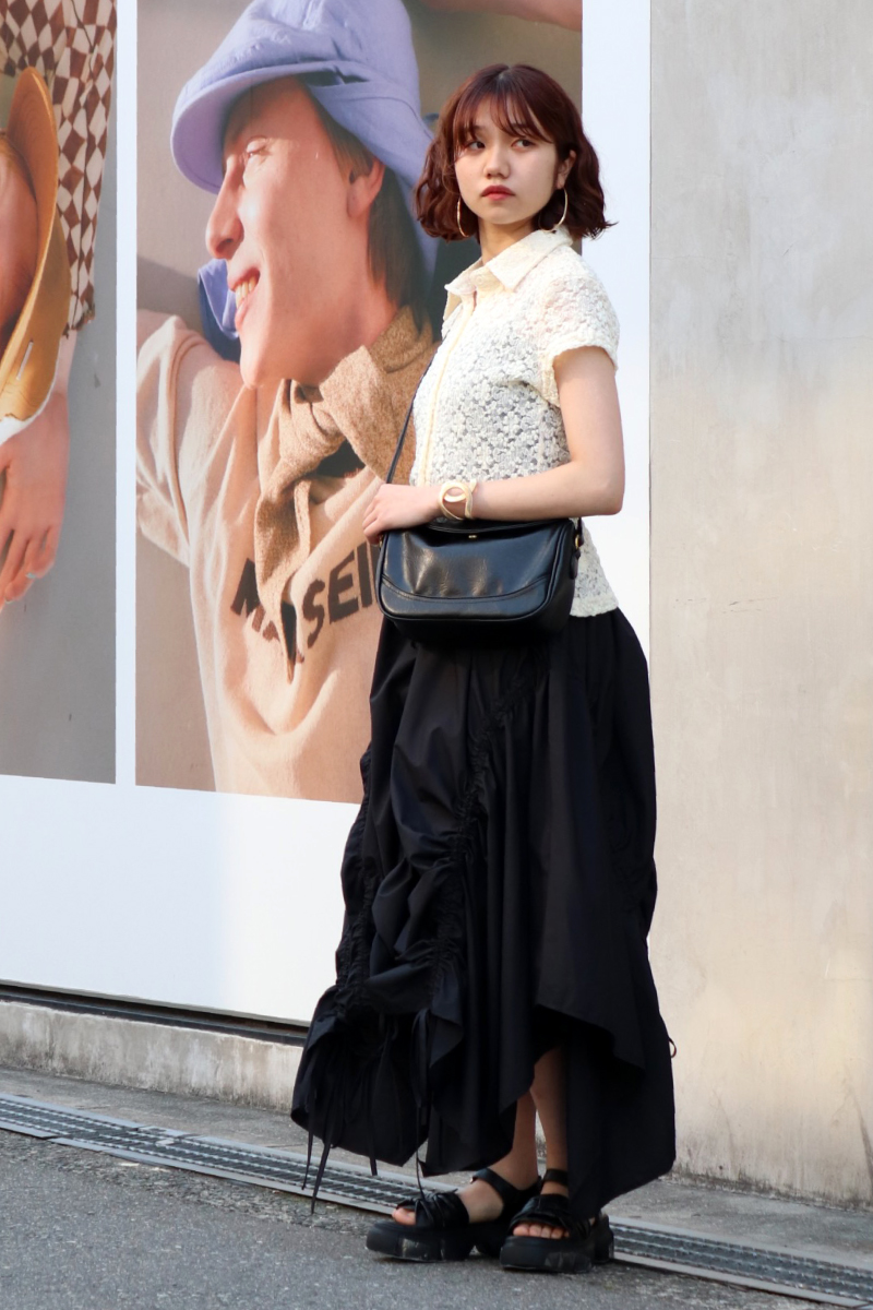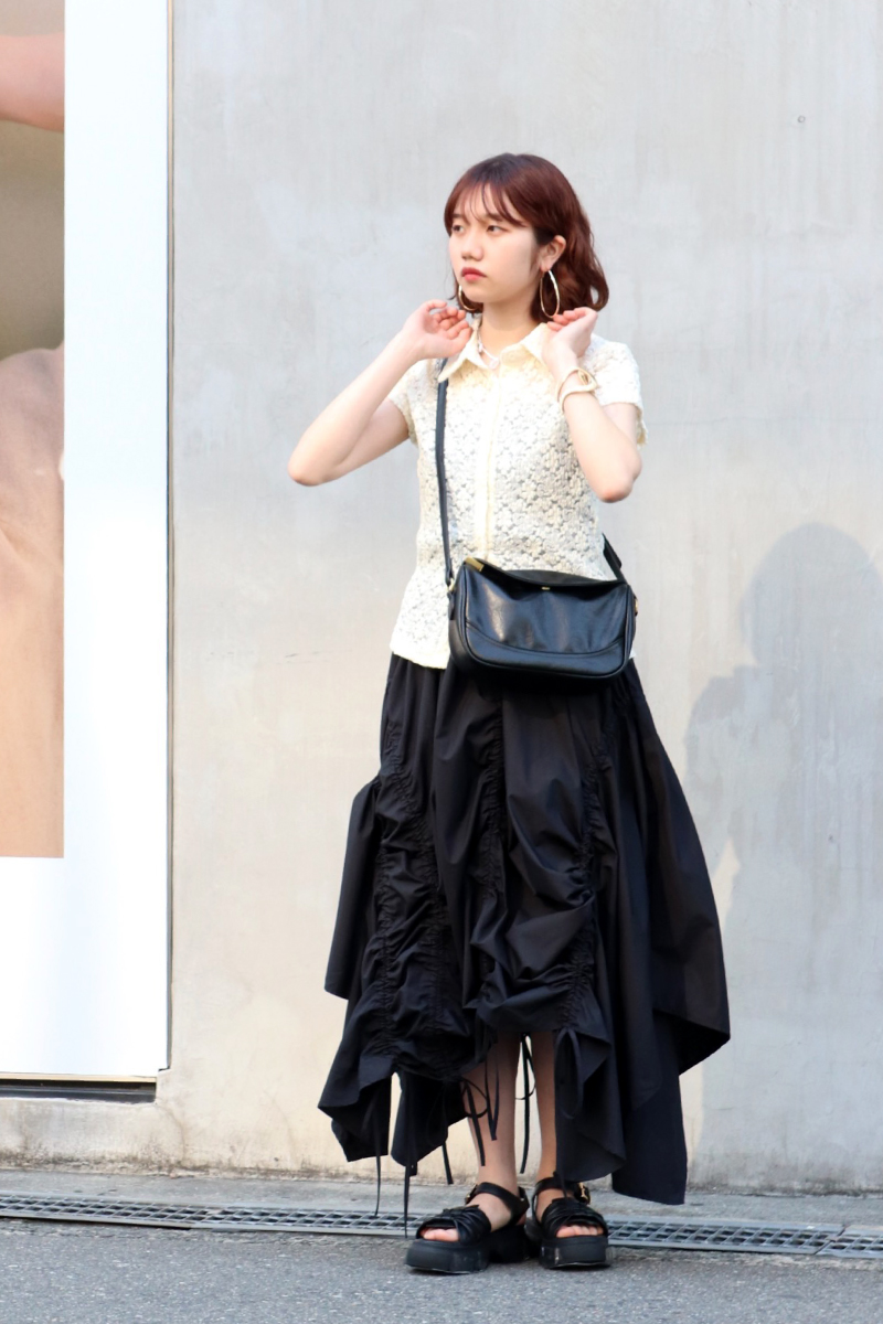 STYLING POINTトップスとスカートのボリューム感にメリハリをつけたことで、むしろバランスのとれた見た目に。シルエットで十分インパクトがとれるので色合いはベーシックに纏めると◎