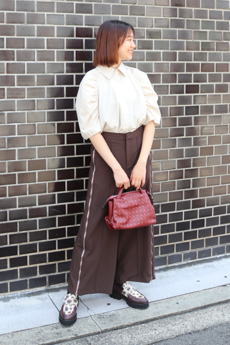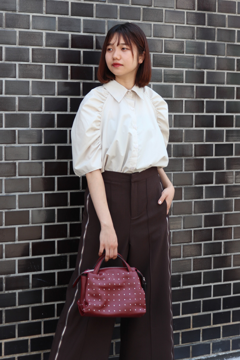 体の華奢見え効果が期待できる立体感ブラウスのフンワリ感でメンズライクな装いをむしろ女性っぽく。定番のブラウスxスラックススタイルが旬顔な雰囲気に