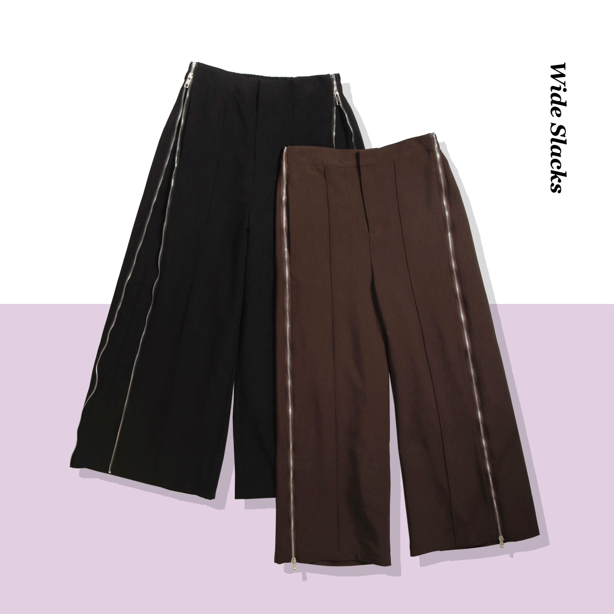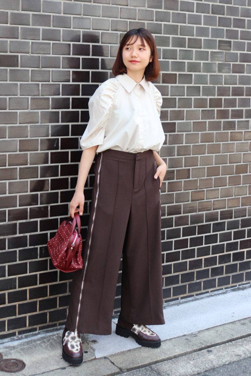 トレンド感満載のワイドスラックス。デザイン性と上品さが融合した遊び心のあるひと品。サイドのジップの開閉でシルエットの調整も可能。