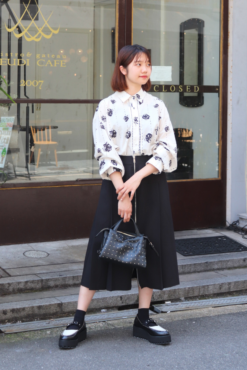 オーバーサイズのシャツに膝丈のスカート。長くも短くもない「あいまいなバランス」を組み合わせて、キレイめアイテム同士なのに堅く見えない理想のバランス加減に着地。小物はエッジを効かせると◎