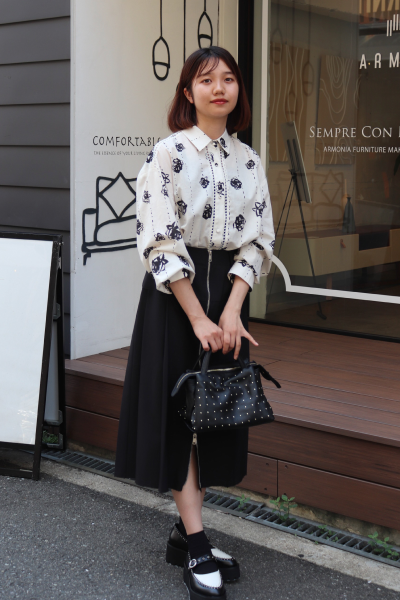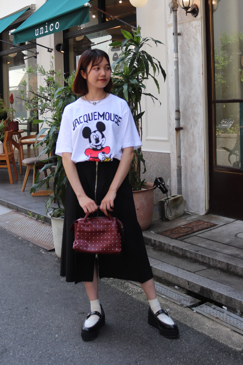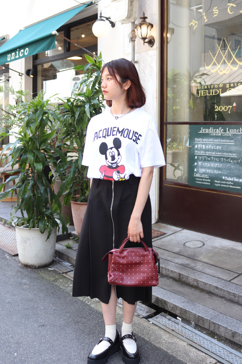 真面目顔のスカートとキャッチィーなプリントTEE。緊張感をほぐし、大人っぽくも親しみやすい印象に。実はカジュアルなプリントほど好相性。
