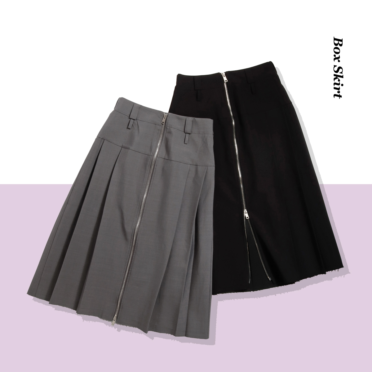 端正な印象のボックスデザインの膝丈スカート。1枚はもちろん、フロントのジップを活かしてパンツの上にレイヤードもおススメ。定番パンツに「甘さ」を足したい時にも◎