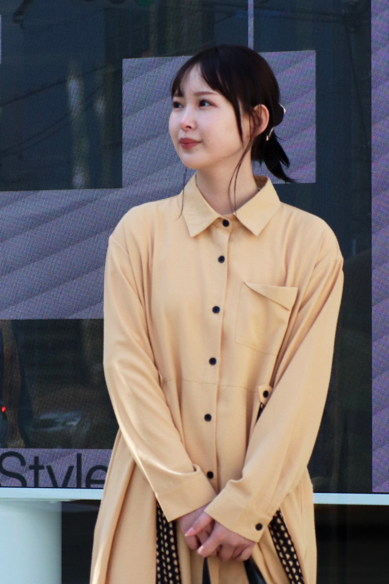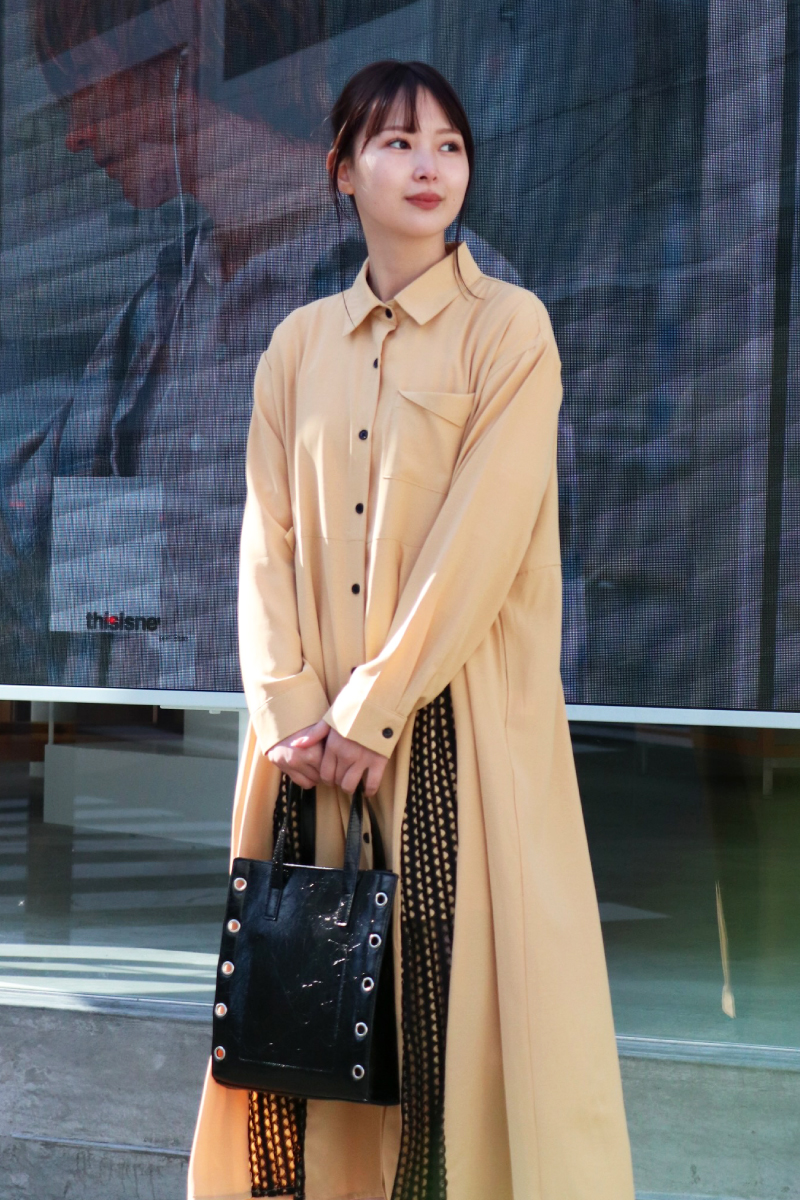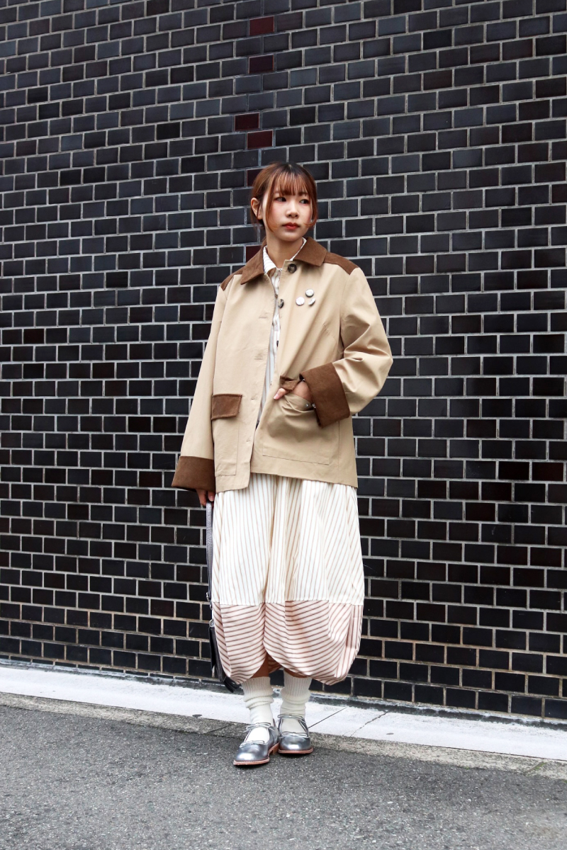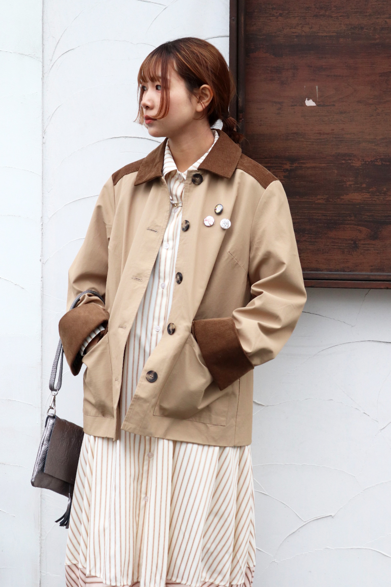 STYLING POINTクラシックな印象のバーンコートに、相性抜群のストライプxシャツ型ワンピースの組み合わせ。ふんわりシルエットで少し崩してフェミニンさをプラス。