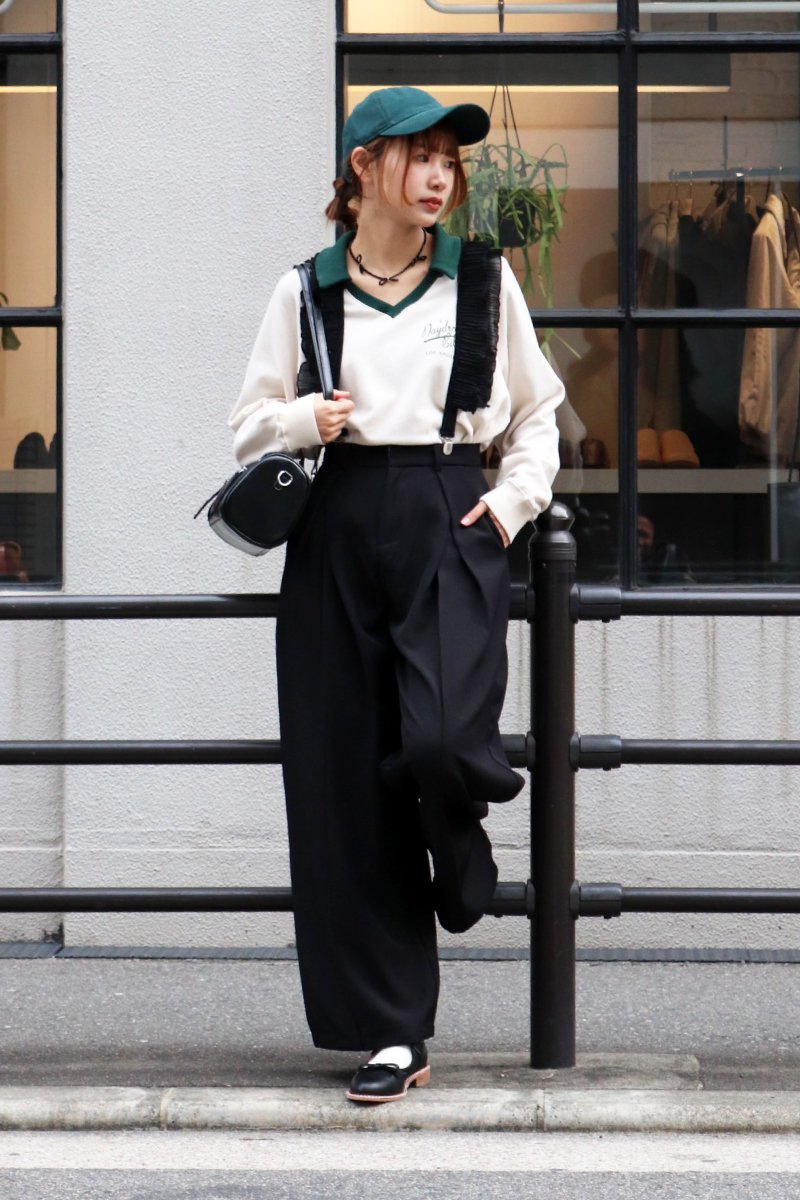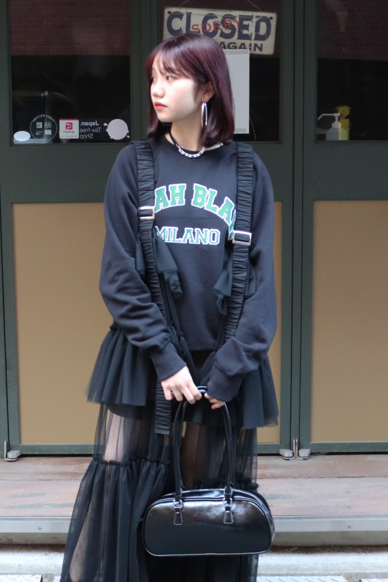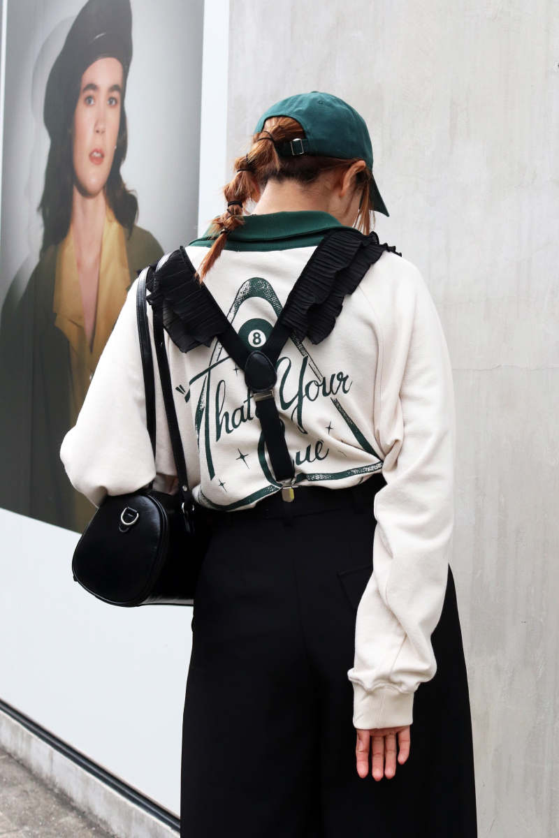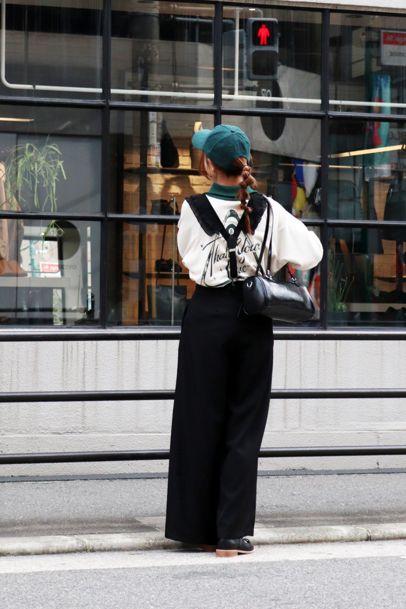 STYLING POINTサロペット風のモードなサスペンダーxパンツをより個性的に演出するヴィンテージライクなゲームスウェット。存在感がありながら古着のようなクタッとした風合いが意外と馴染み良くて◎
