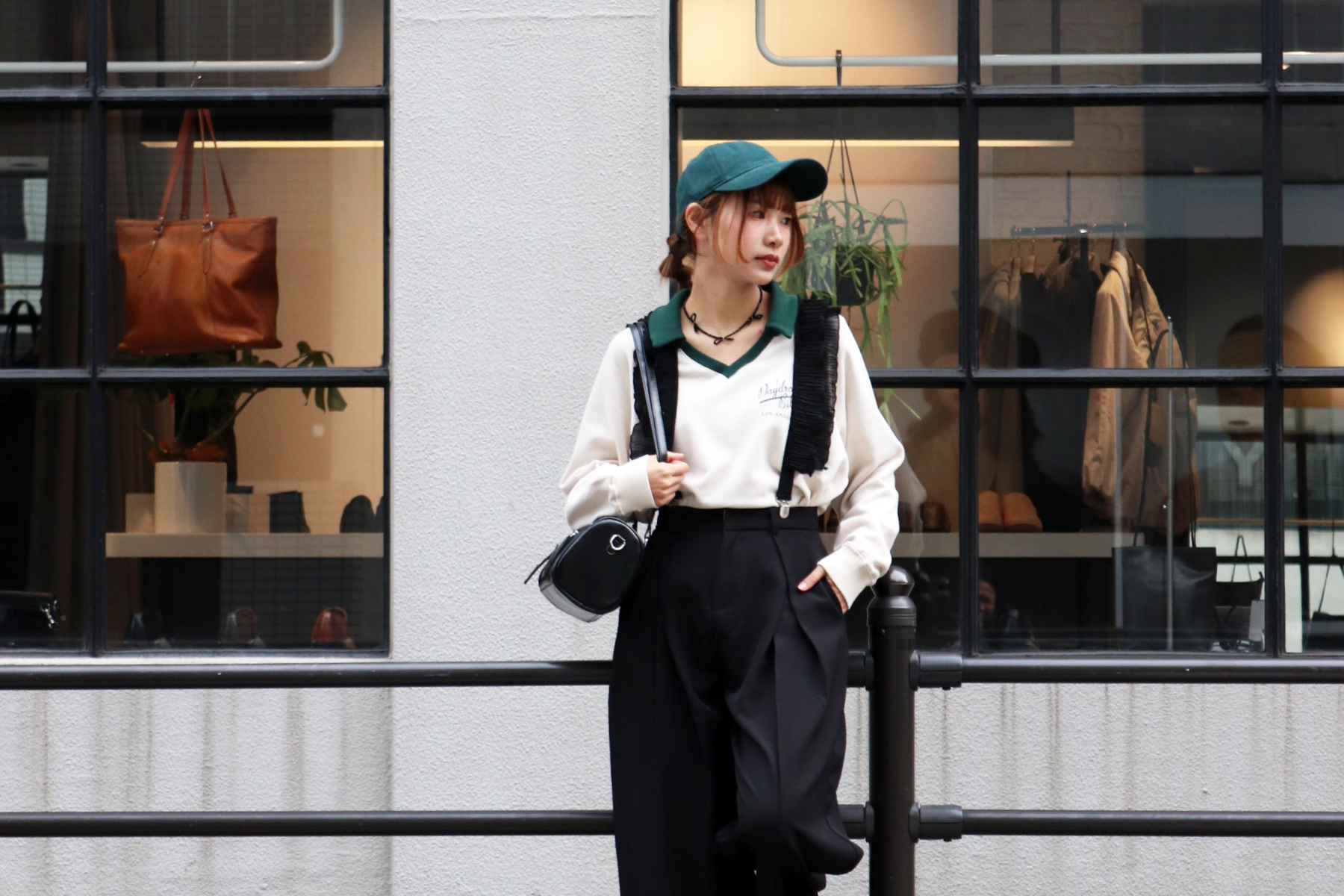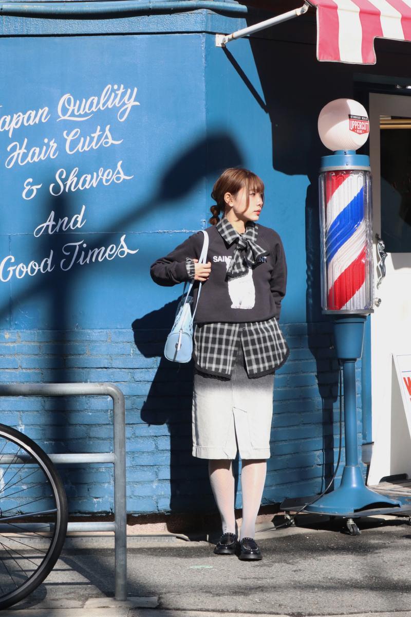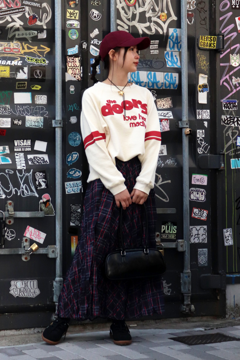 STYLING POINT80年代のアメリカドラマのプレッピースタイルからインスピレーション得たコーデ。最強の組み合わせのロゴスウェットとチェック柄は色合いで鮮度をUP