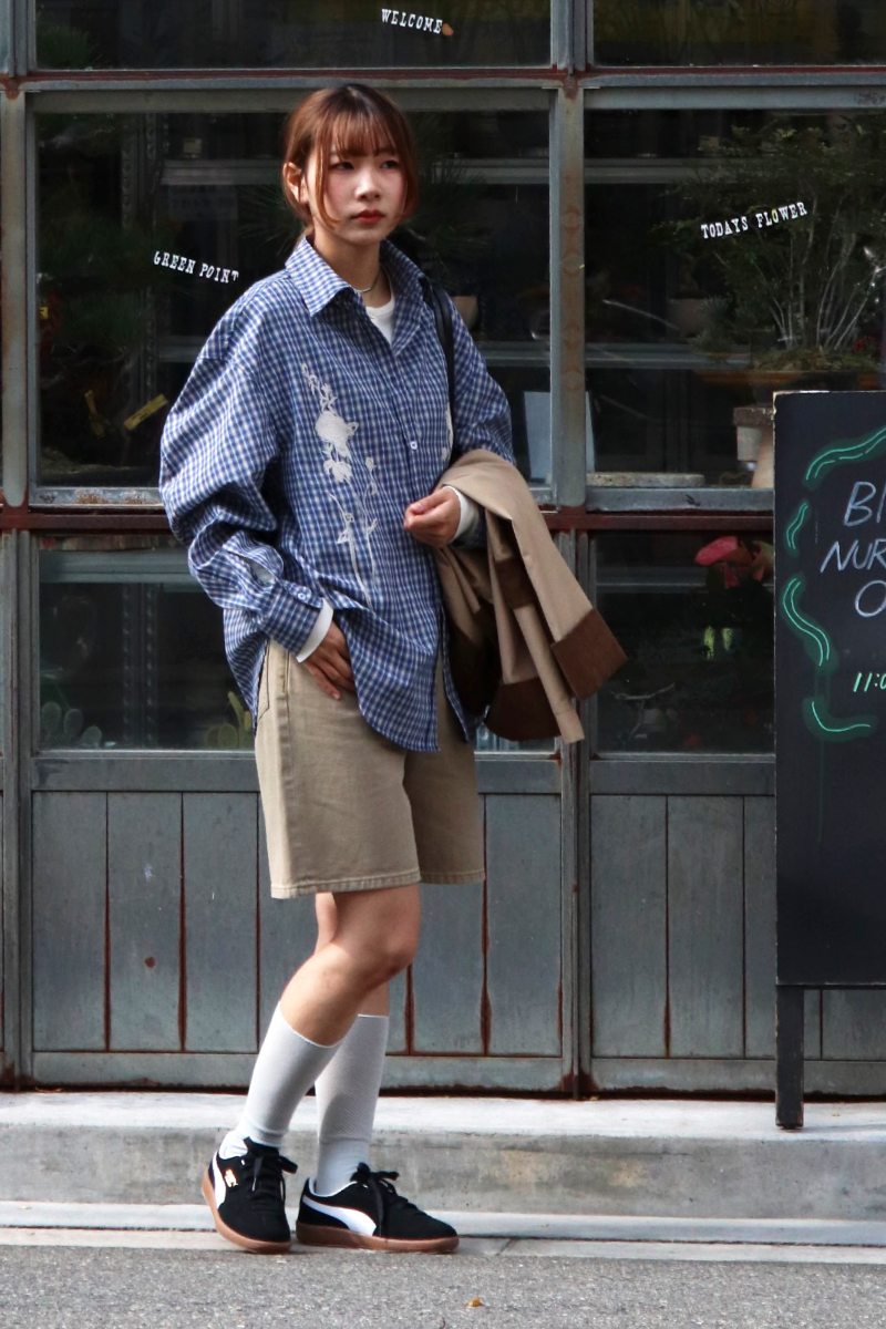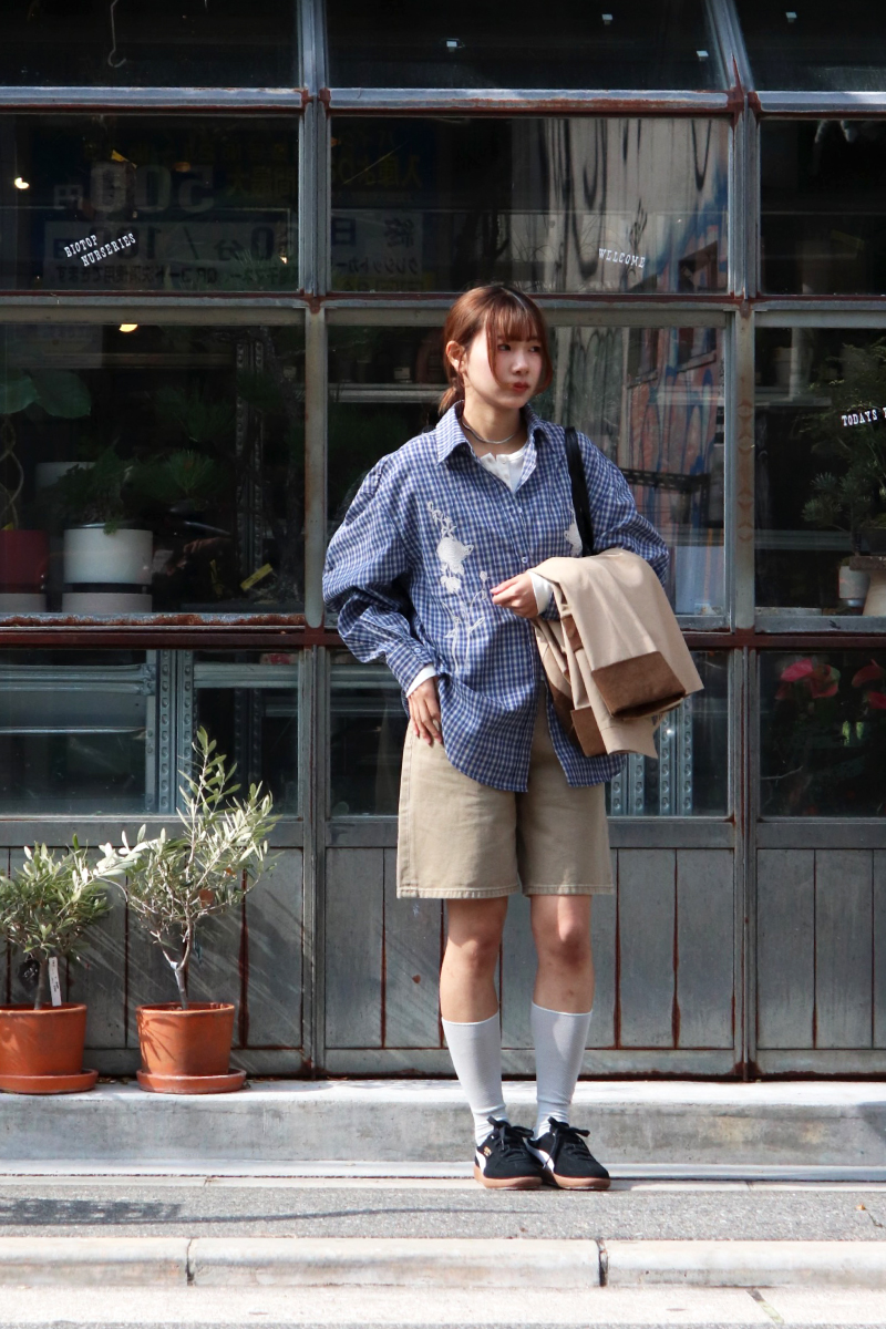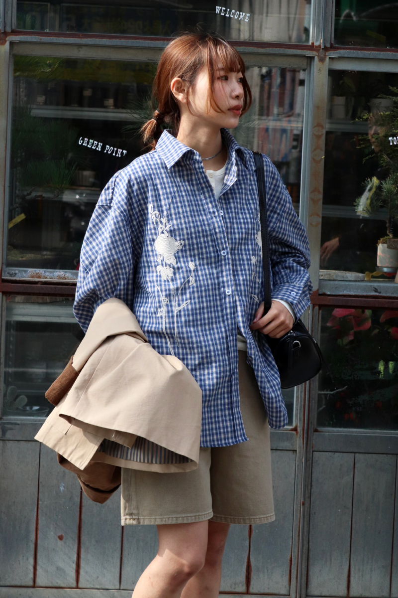 STYLING POINTオーバーサイズシャツのルーズなシルエットを活かしてボトムはスッキリと。爽やか色のチェック柄と胸元の刺繍がアクセントになってカジュアルに纏めても上品な印象に仕上がります。