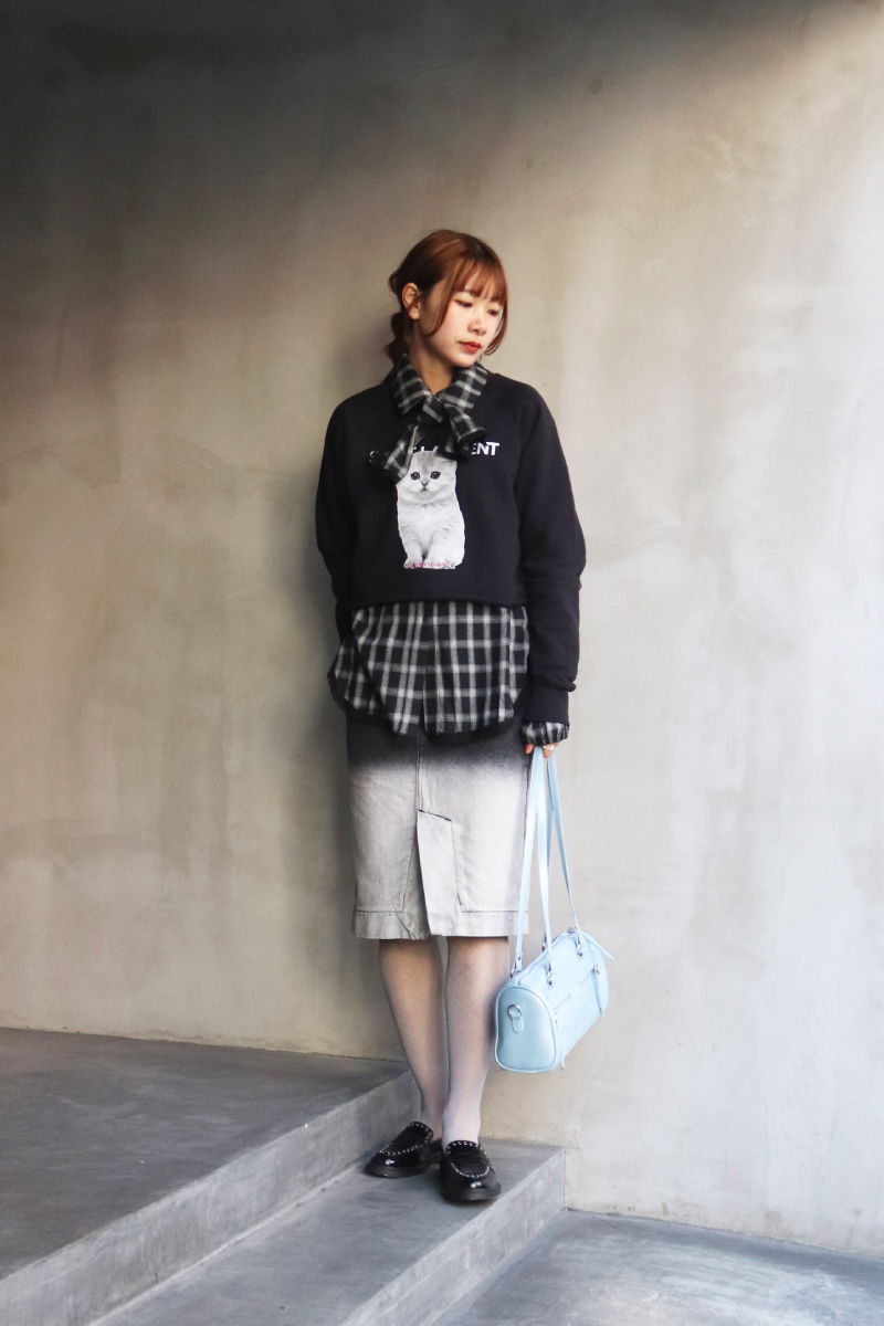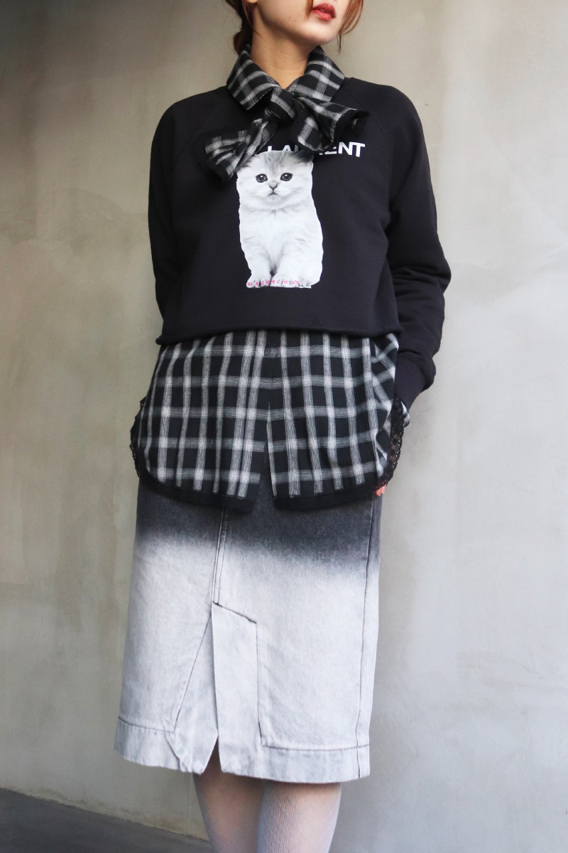 STYLING POINTクロップド丈でレイヤードを楽しめる1枚!ボウタイブラウスに相対するタイダイデニムスカートを合わせることでCOQULEっぽいコーディネートに!