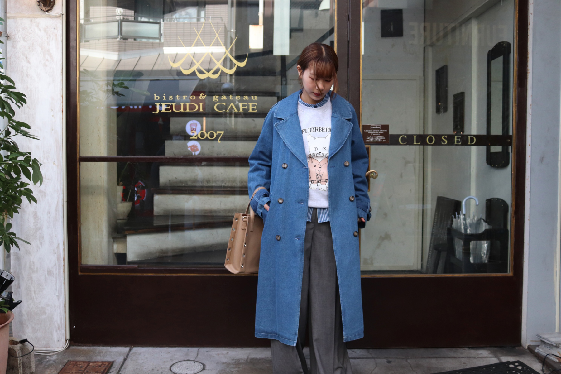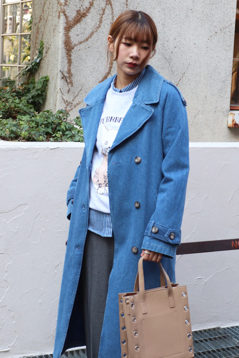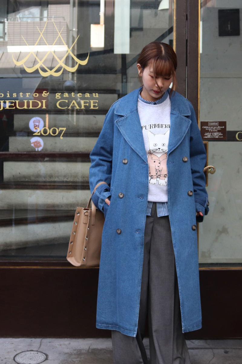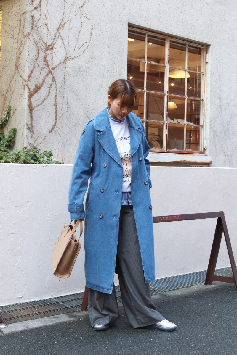 STYLING POINTトレンチ子犬があまりに可愛いので お揃いでデニムトレンチとピンストライプパンツ合わせてマニッシュに着こなしました!ラフな雰囲気になりがちな杢スウェットを端正にまとめたMIXコーデ!