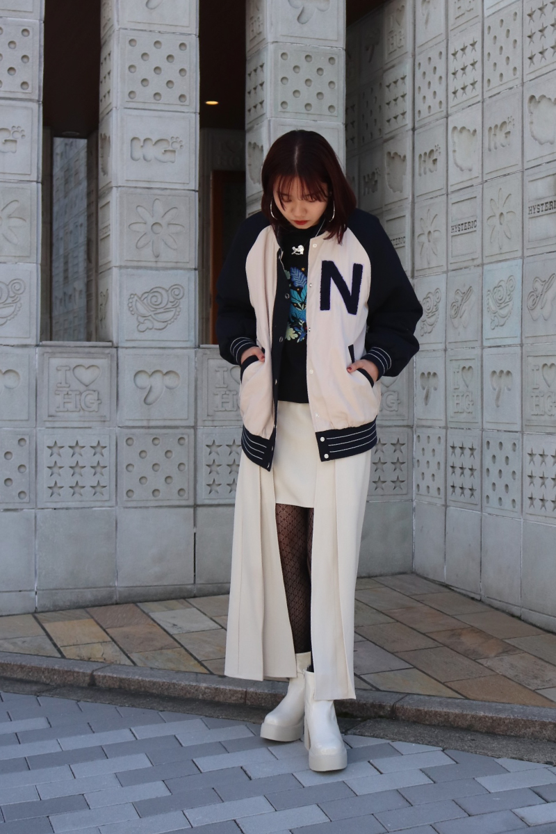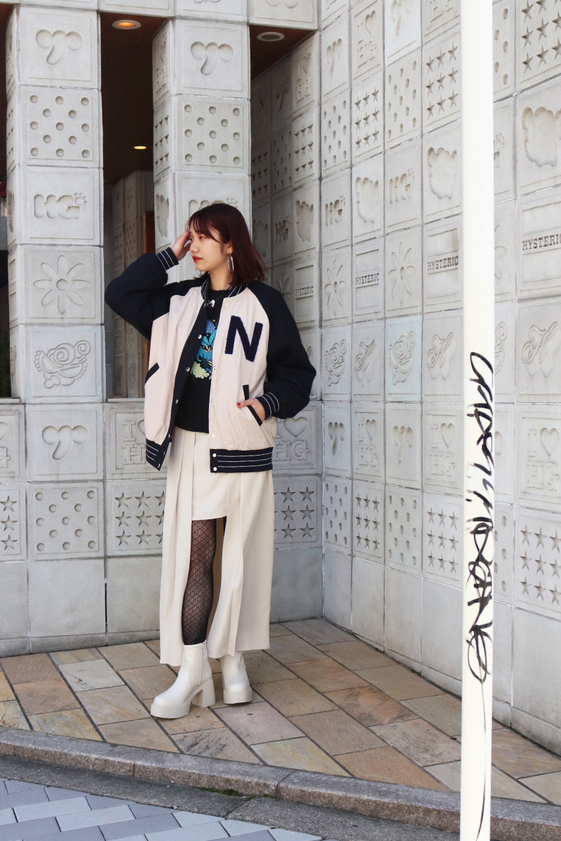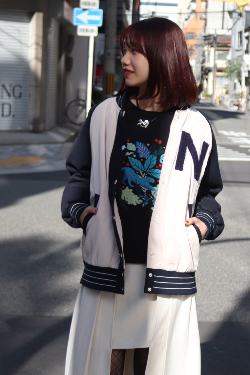 STYLING POINT特別感のあるスタジャン。カラフルなプリントを覗かせて、モードなスカートを組み合わせると、一気に「無難」と差がつくコーディネートに昇華!