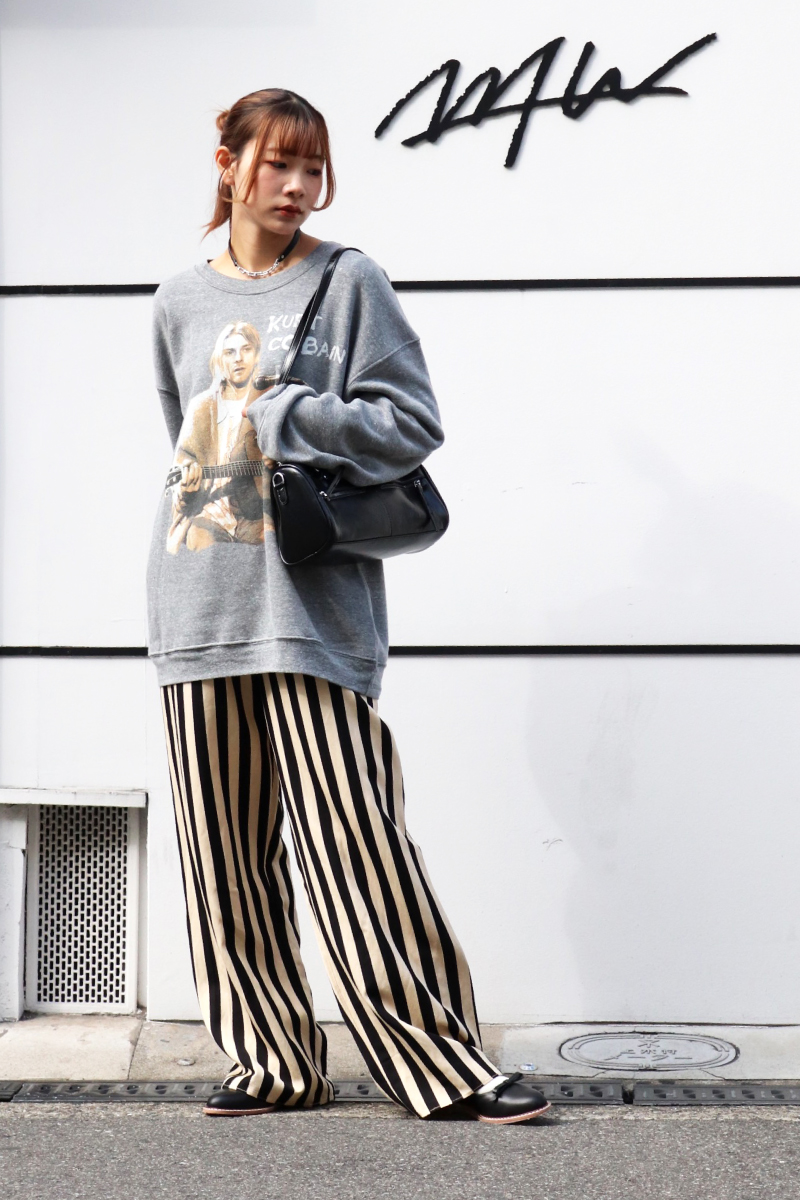 STYLING POINTオーバーサイズのロックスウェットをクラシカルなアイテムと合わせるとキレイめなハズしに纏まります。「ボーイッシュ」⇒「品のあるユルさ」に変換したコーディネート