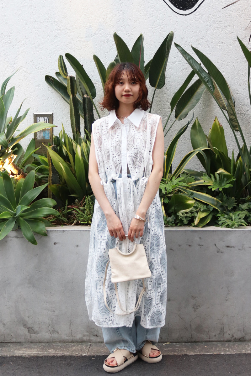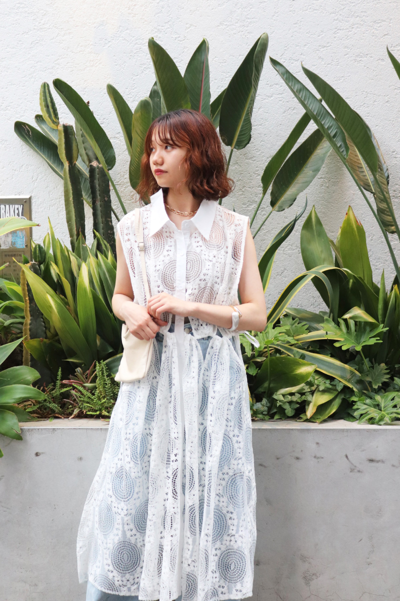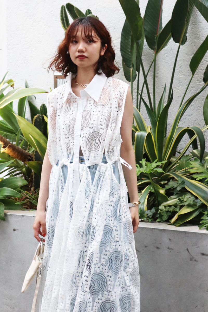 STYLING POINTホワイトレースのワンピースが持つフェミニンでクリーンな印象を保ちながら、気張らないデニムを合わせる。フェニミンなラフさが生まれ「カジュアル以上」な仕上がり。