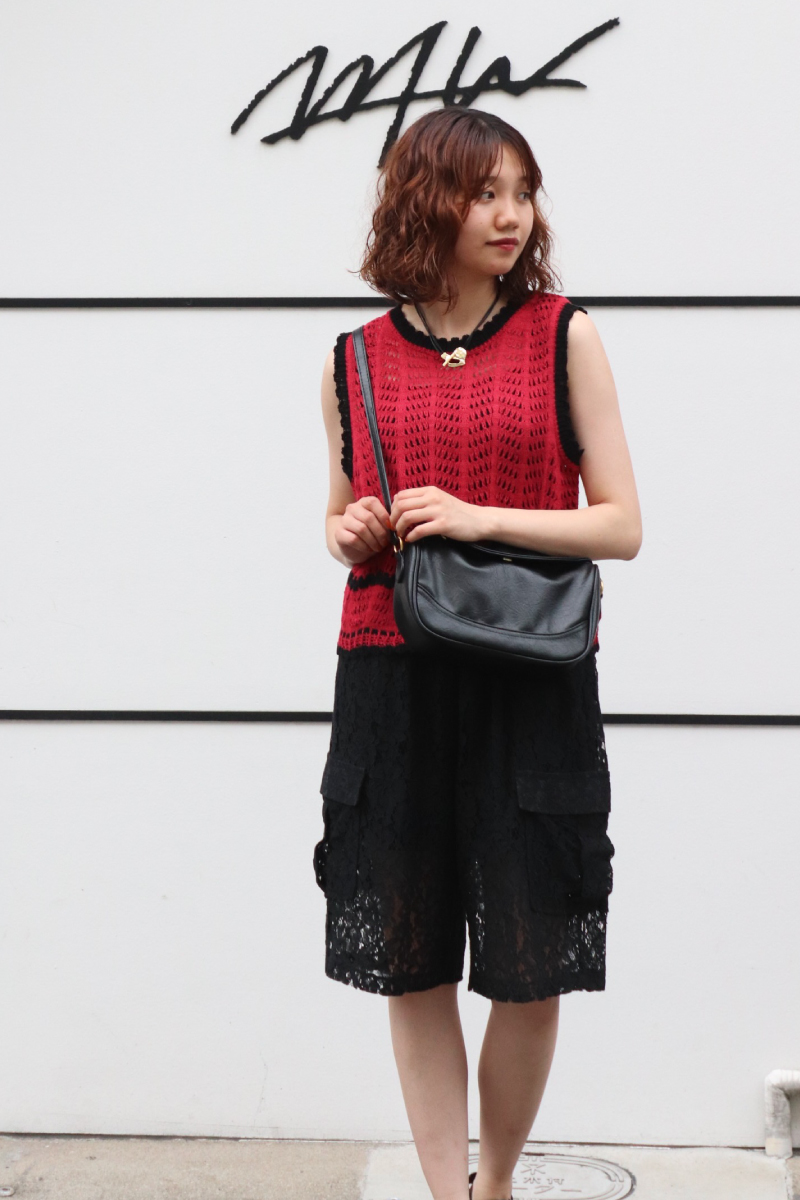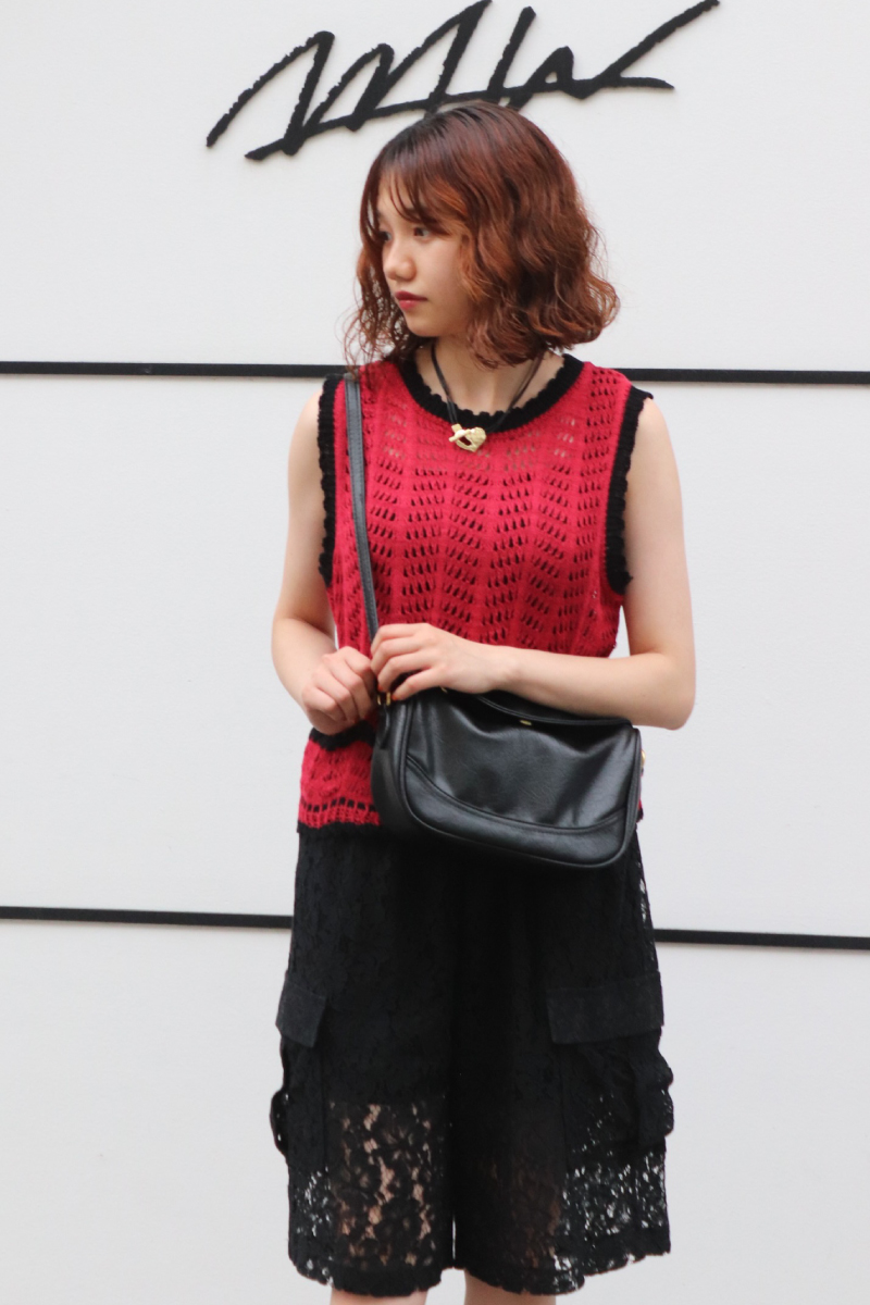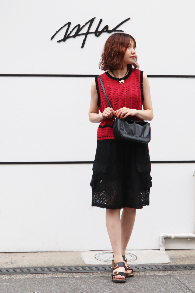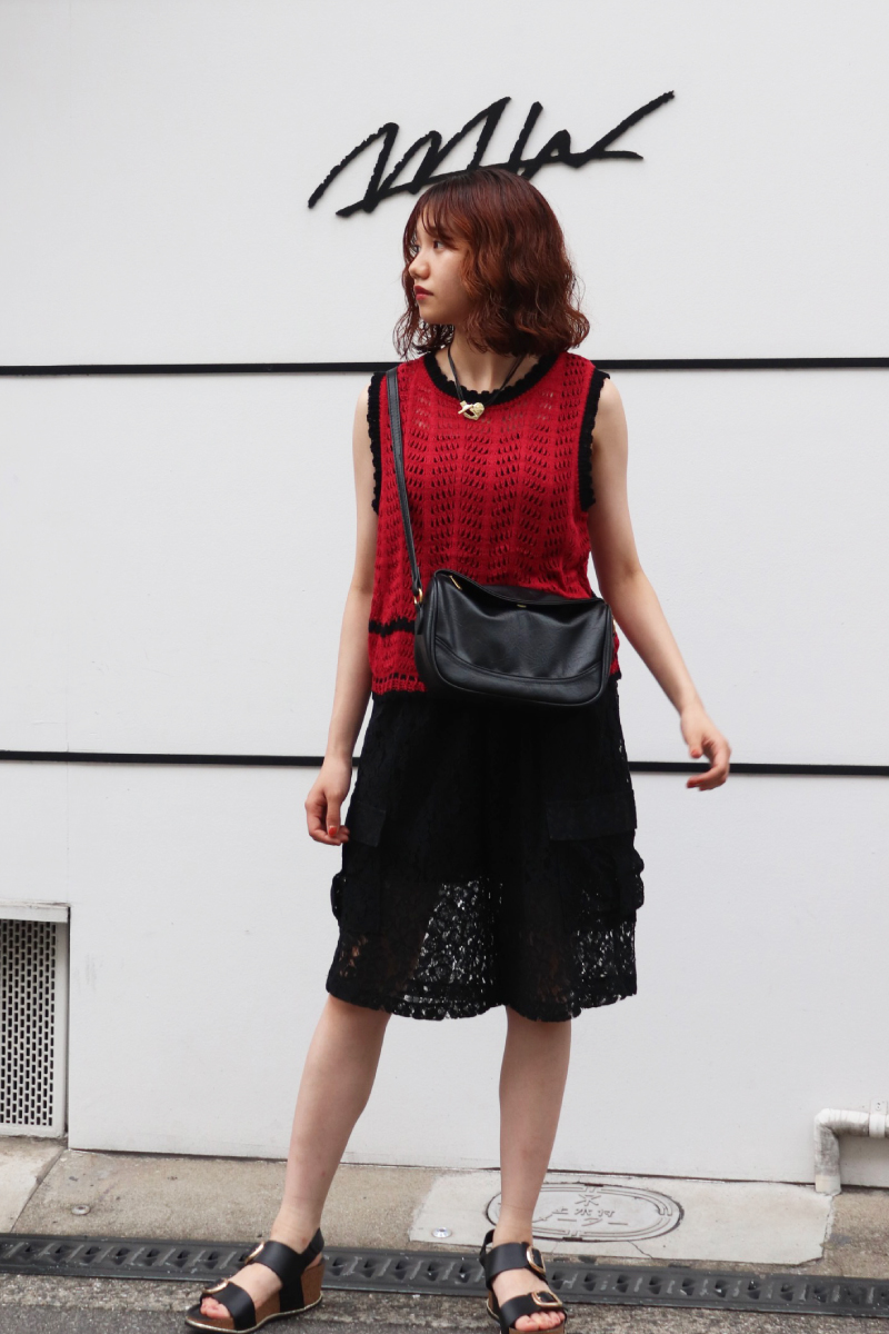 STYLING POINT「赤x黒」という鮮やかなコントラストも素材を選ぶとオシャレ度が上がる。色の持つ強さにニットxレースの透け感と柔らかさが加わって◎。