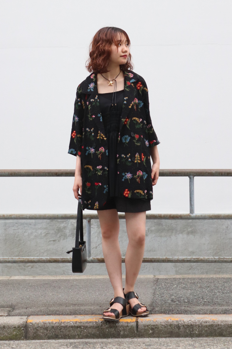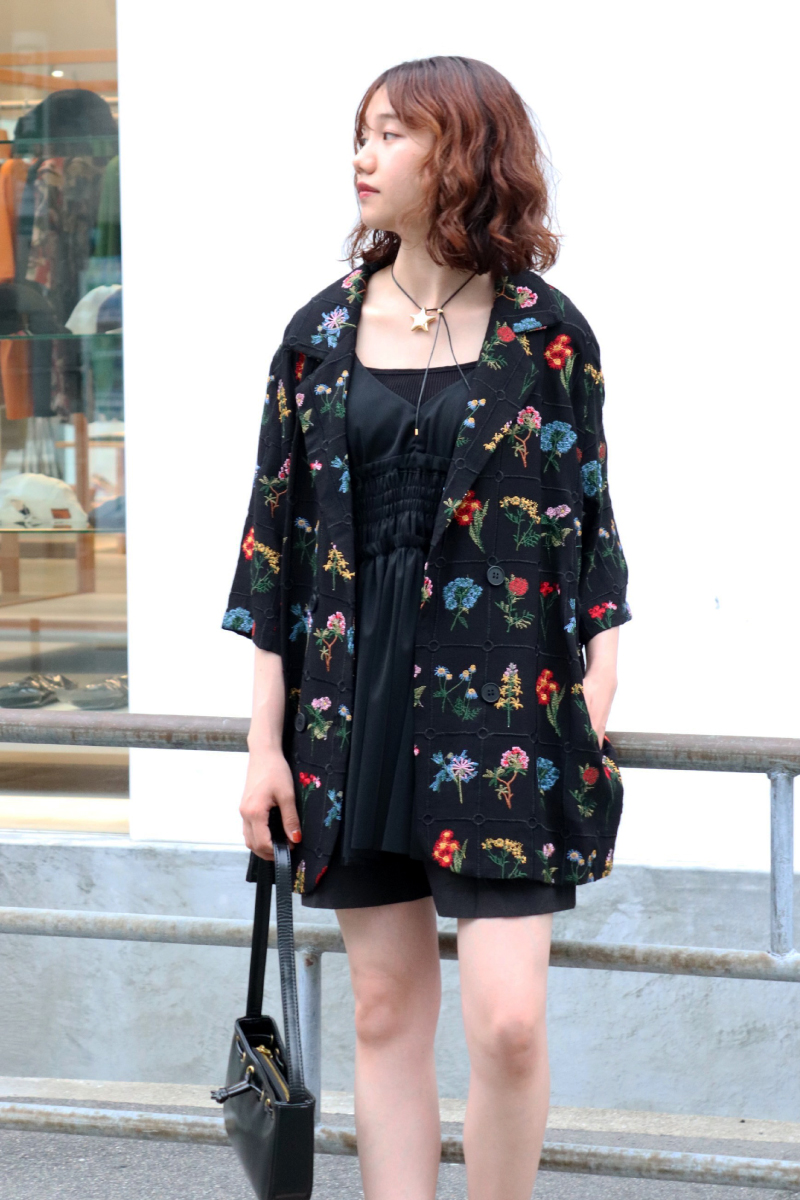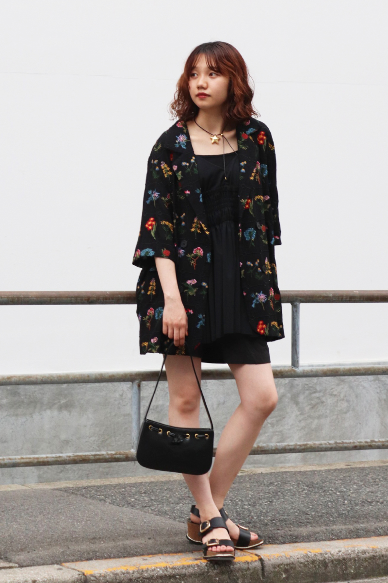 STYLING POINT1点モノの雰囲気が漂うジャケットを主役に、他はブラックで統一。ブラック1色でも素材を選ぶと単調になりすぎず華やかな面持ちに。