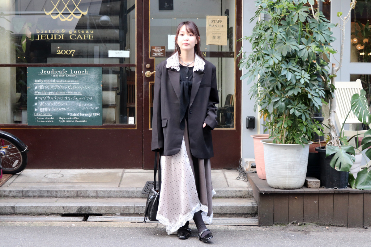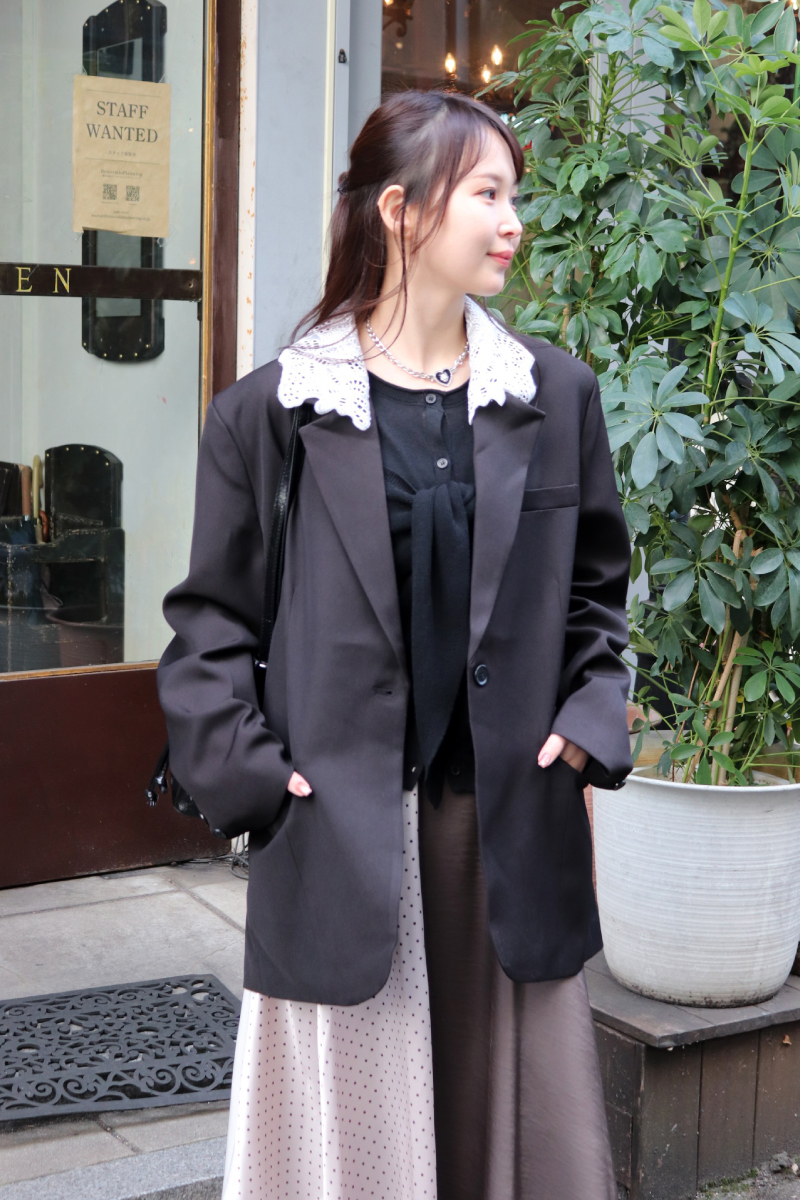STYLING POINT大きなサイジングのジャケットはもはや主流。可愛さに振り切ったスカートを合わせて甘さを加えても、程よい大人フェミニンに着地。