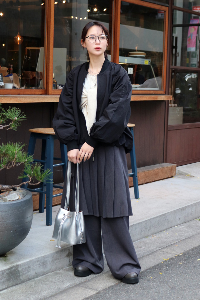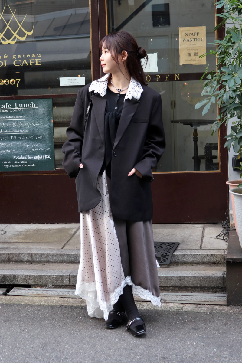STYLING POINTハンサムとフェミニンの新鮮なスタイリング。トップス・ボトムスどちらもレイヤードデザインにして斬新かつ親近感のある面持ちに。