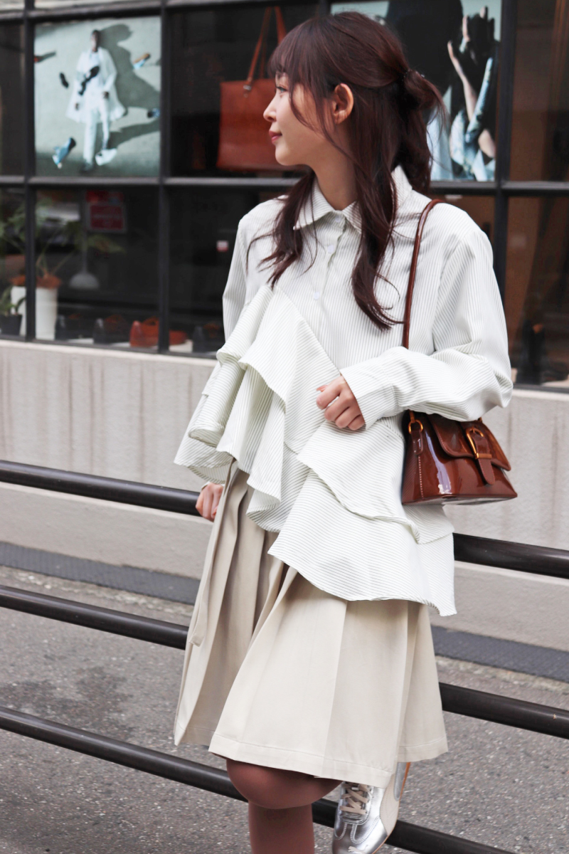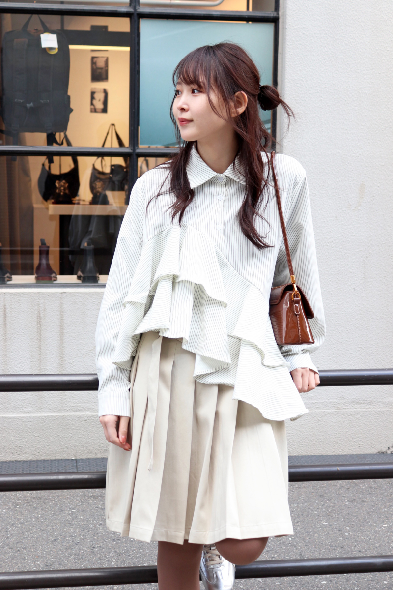 STYLING POINTコーディネートをモードへ導くアシンメトリーなフリルシャツ。躍動感のあるフリルに短めのスカートを合わせて良好なバランスに。