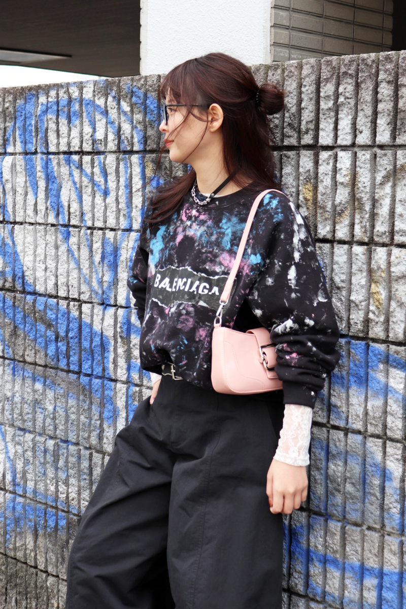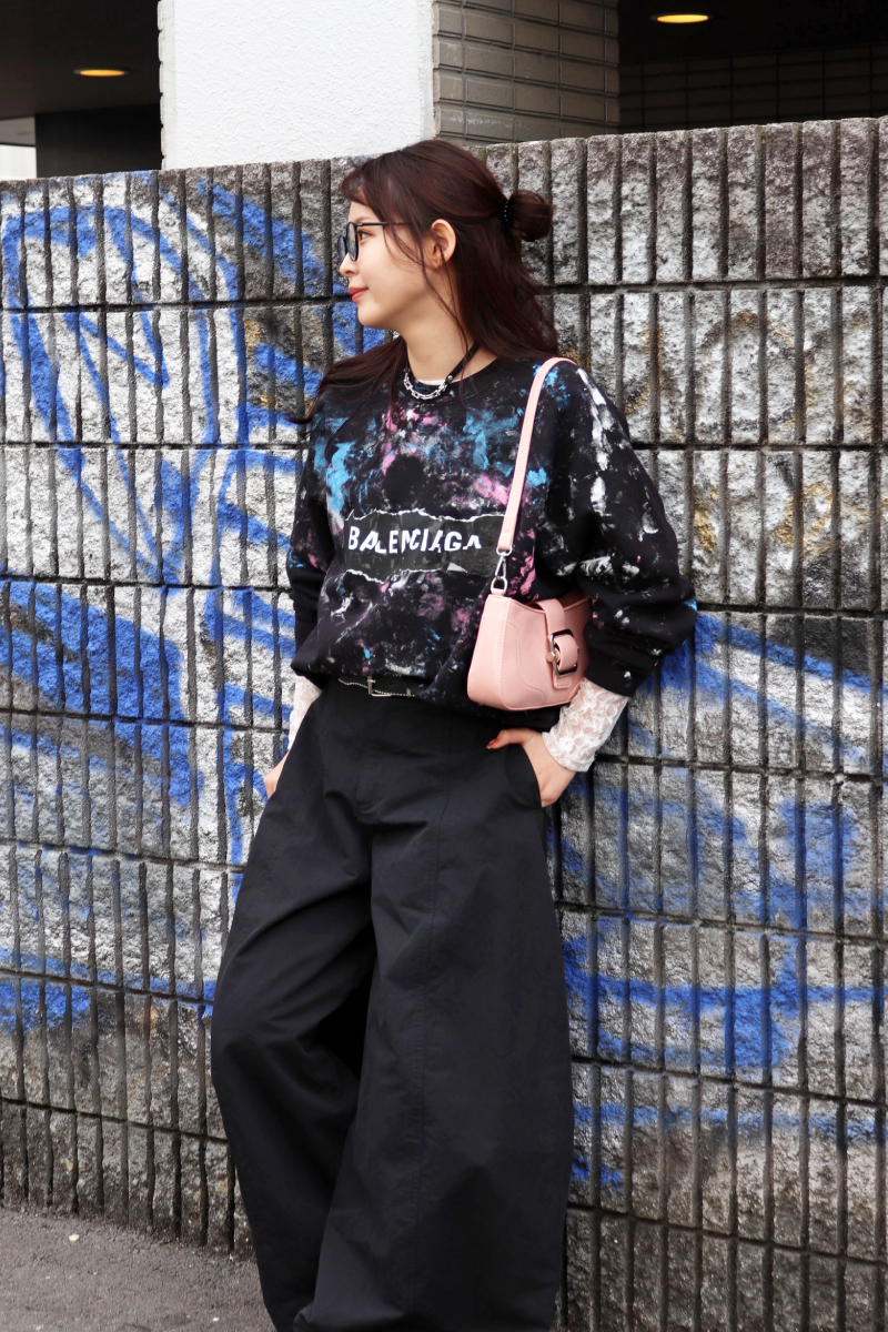 STYLING POINTラフなイメージに直結するスウェットとバレルパンツ。両者の持つ気楽なシルエットの調整役としてエッジィな小物を取り入れる◎