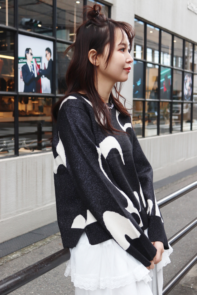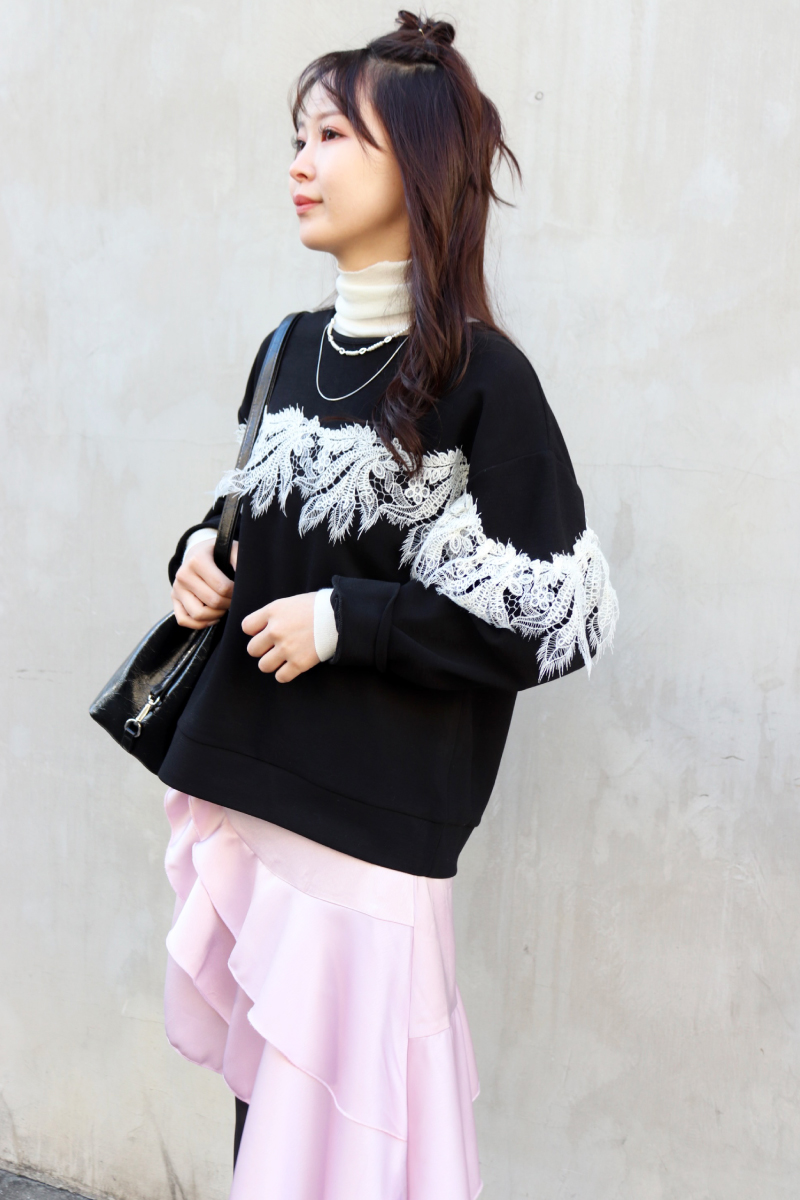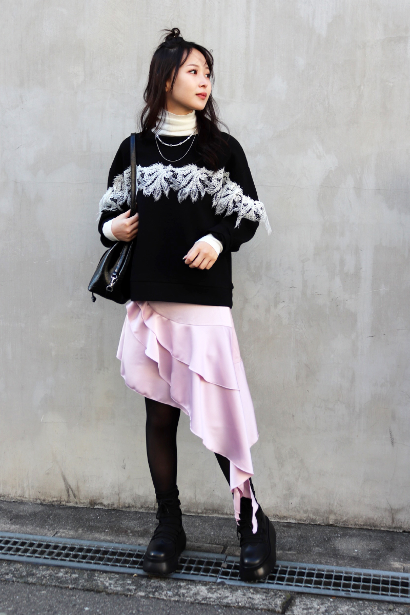 STYLING POINTニットxパンツの定番コーデにチュールを足すことで無彩色でも個性を宿すスタイリングに。試してみたいシルエットや装飾はぜひモノトーンでチャレンジ。