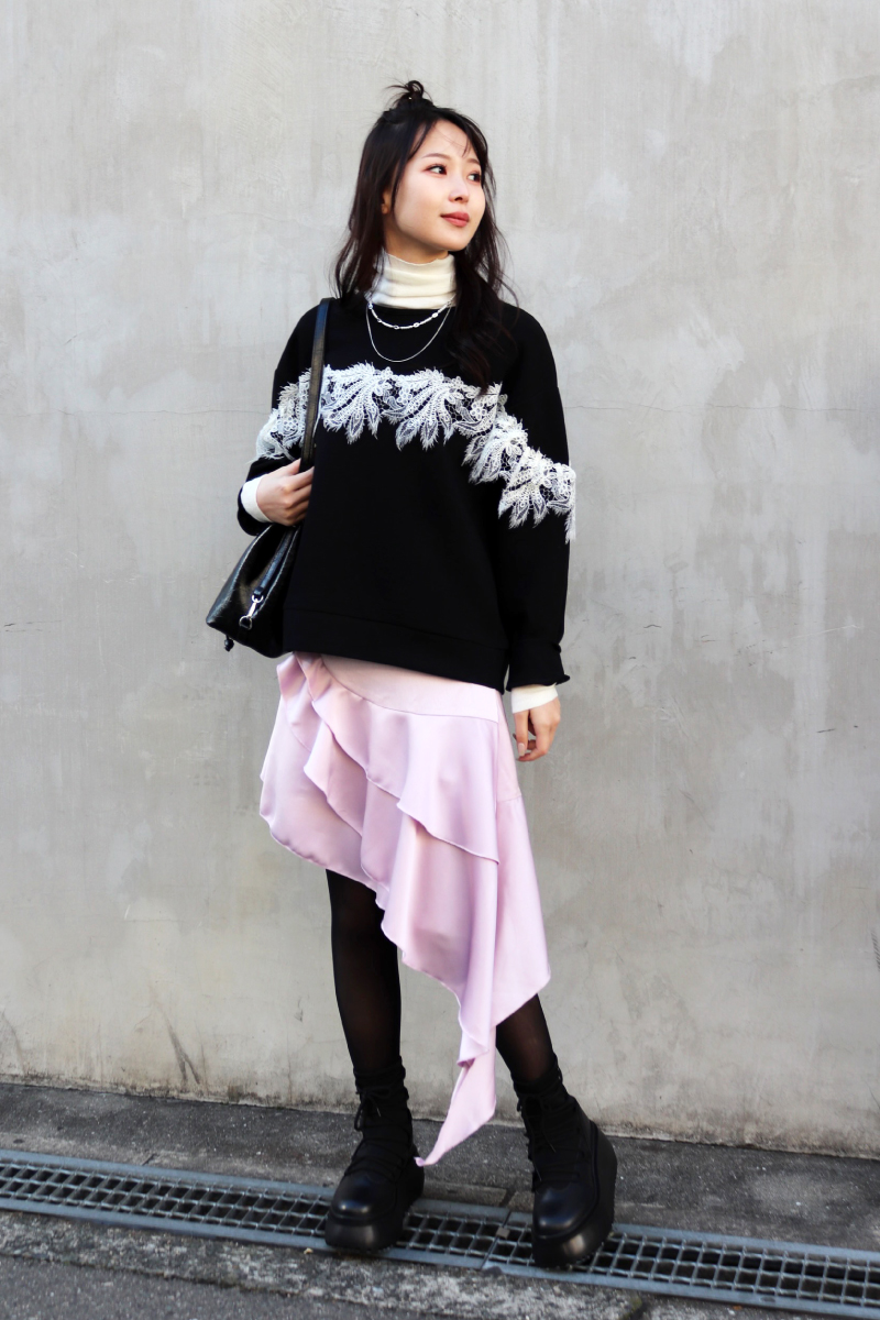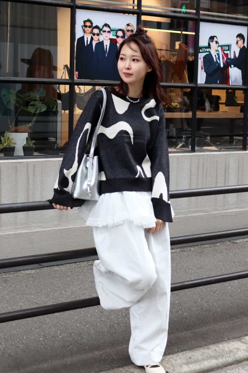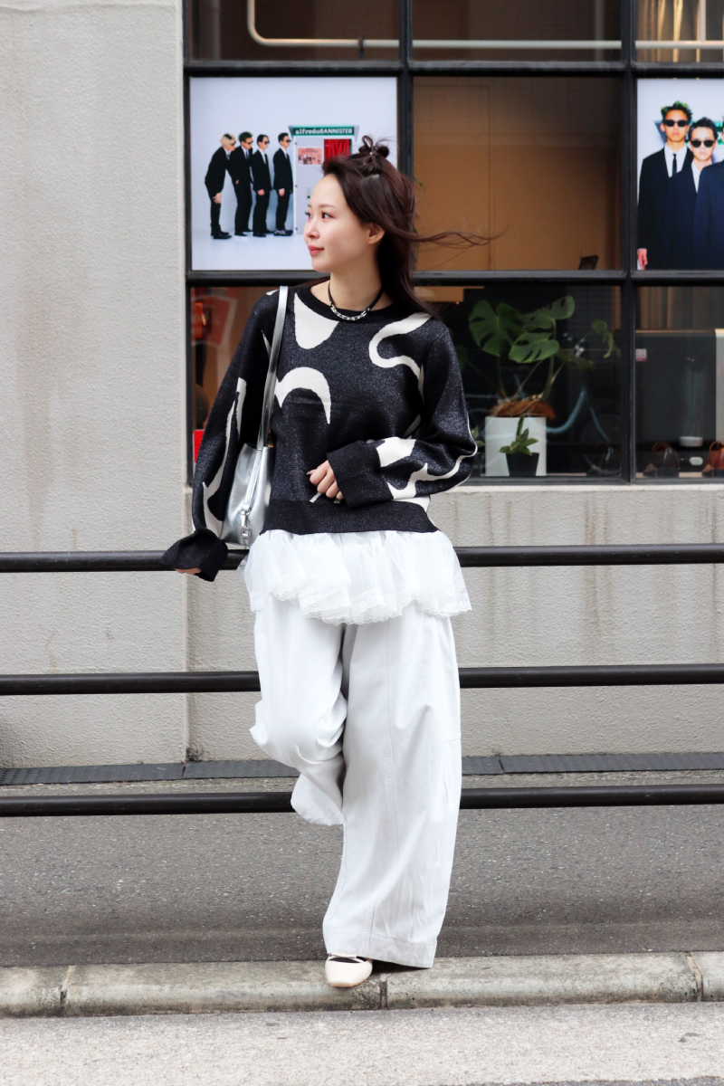 STYLING POINTニットxパンツの定番コーデにチュールを足すことで無彩色でも個性を宿すスタイリングに。試してみたいシルエットや装飾はぜひモノトーンでチャレンジ。