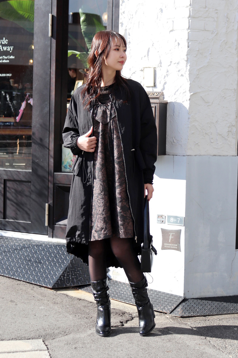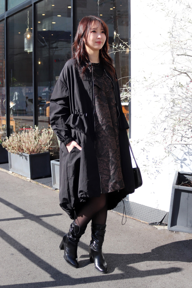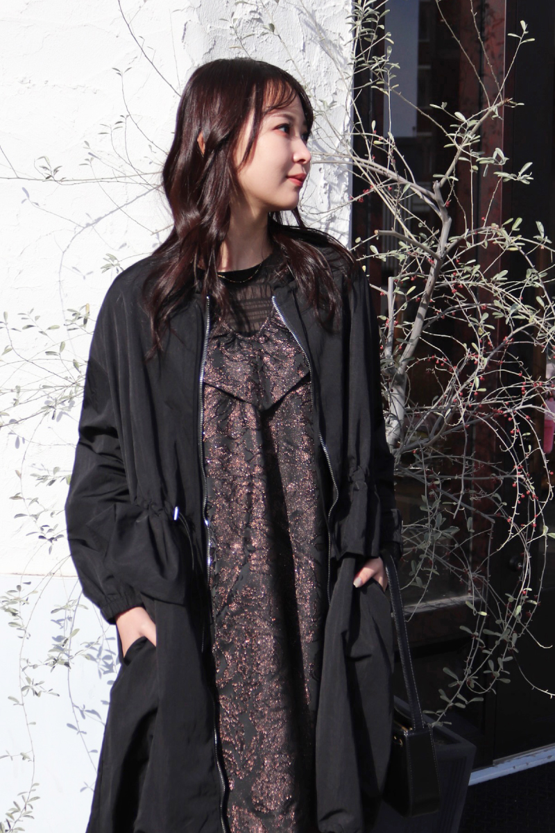 STYLING POINTドレッシーなワンピースを包むドラマティックに揺れ動くアシンメトリーなコート。2つのアイテムの質感とデザインが合わさると、ダークトーンでも華やか。