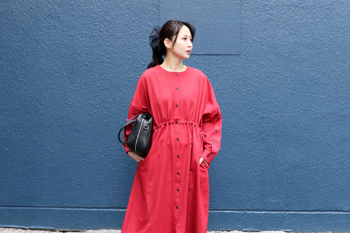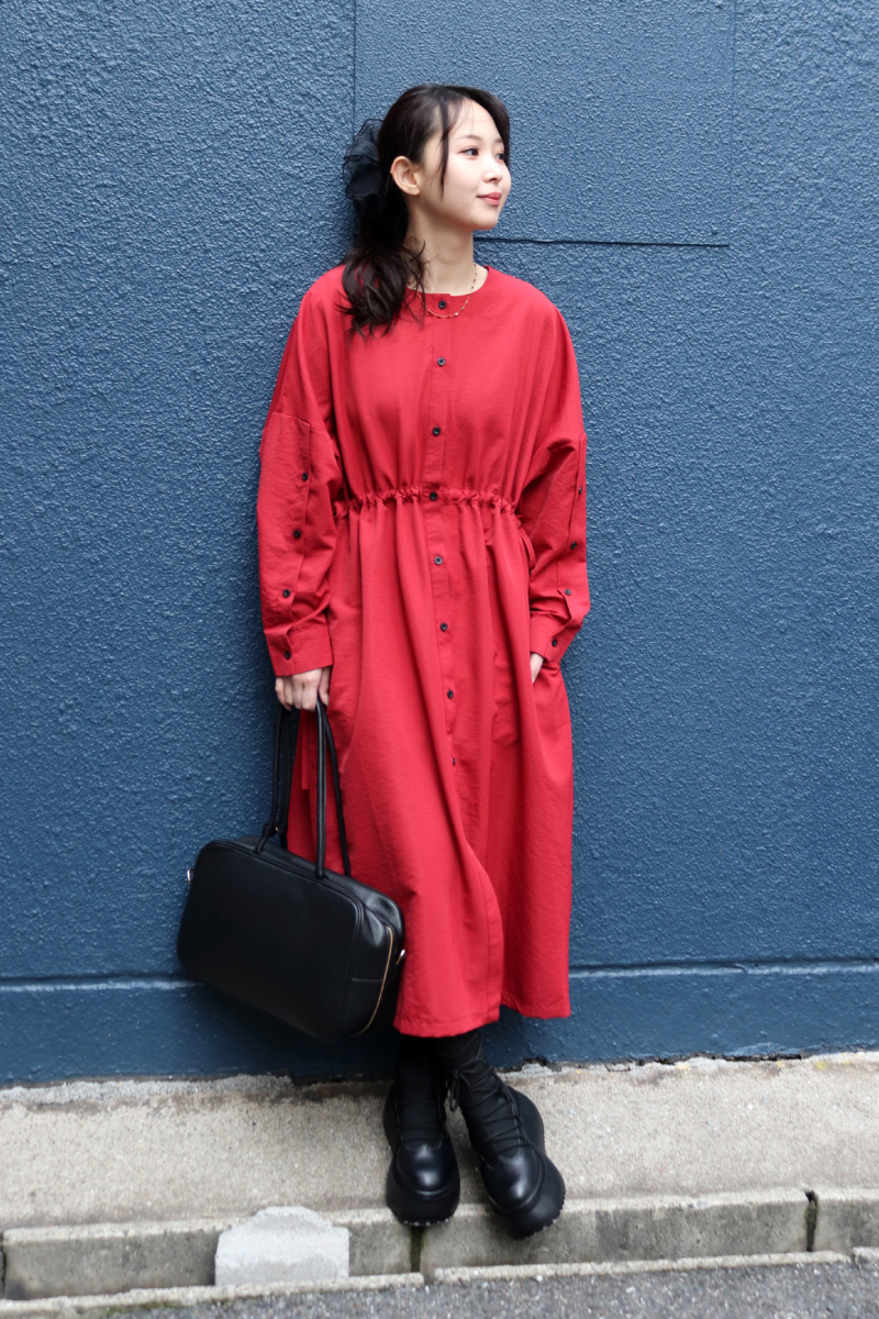 STYLING POINT1枚でも鮮度の上がる赤のワンピース。体をキレイに魅せてくれる切り替えと落ち感。コートの中でも着映えるデザイン。