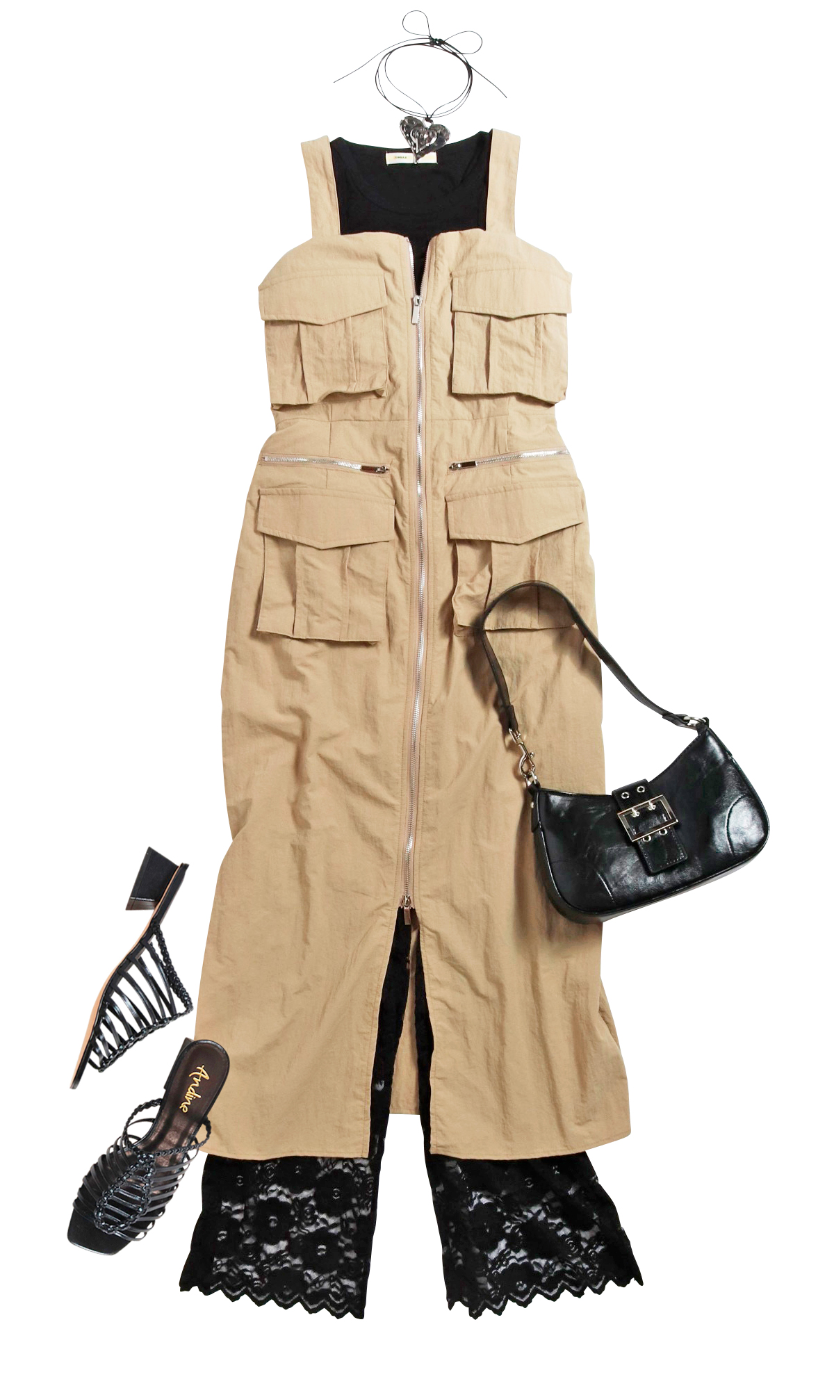 アクティブなミリタリーワンピースを「大人」に整えるレースの意外性。落ち着きのある黒の総レースを裾から覗かせセンシュアルなギャップを加算。ロング丈同士のレイヤードもレースなら重くならない