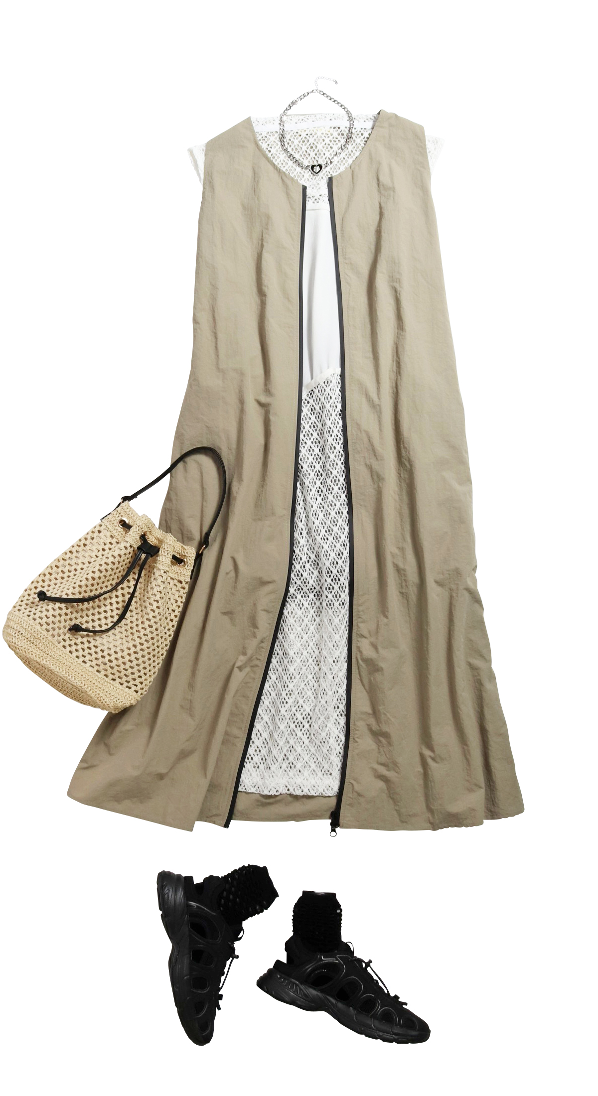 ジップを全て開けてロングベストとして涼しげに。メッシュ素材のロングトップxカゴバッグを合わせて、さらに清涼感を加算すると、重たくなりがちなミリタリーを真夏のフレッシュな印象に◎