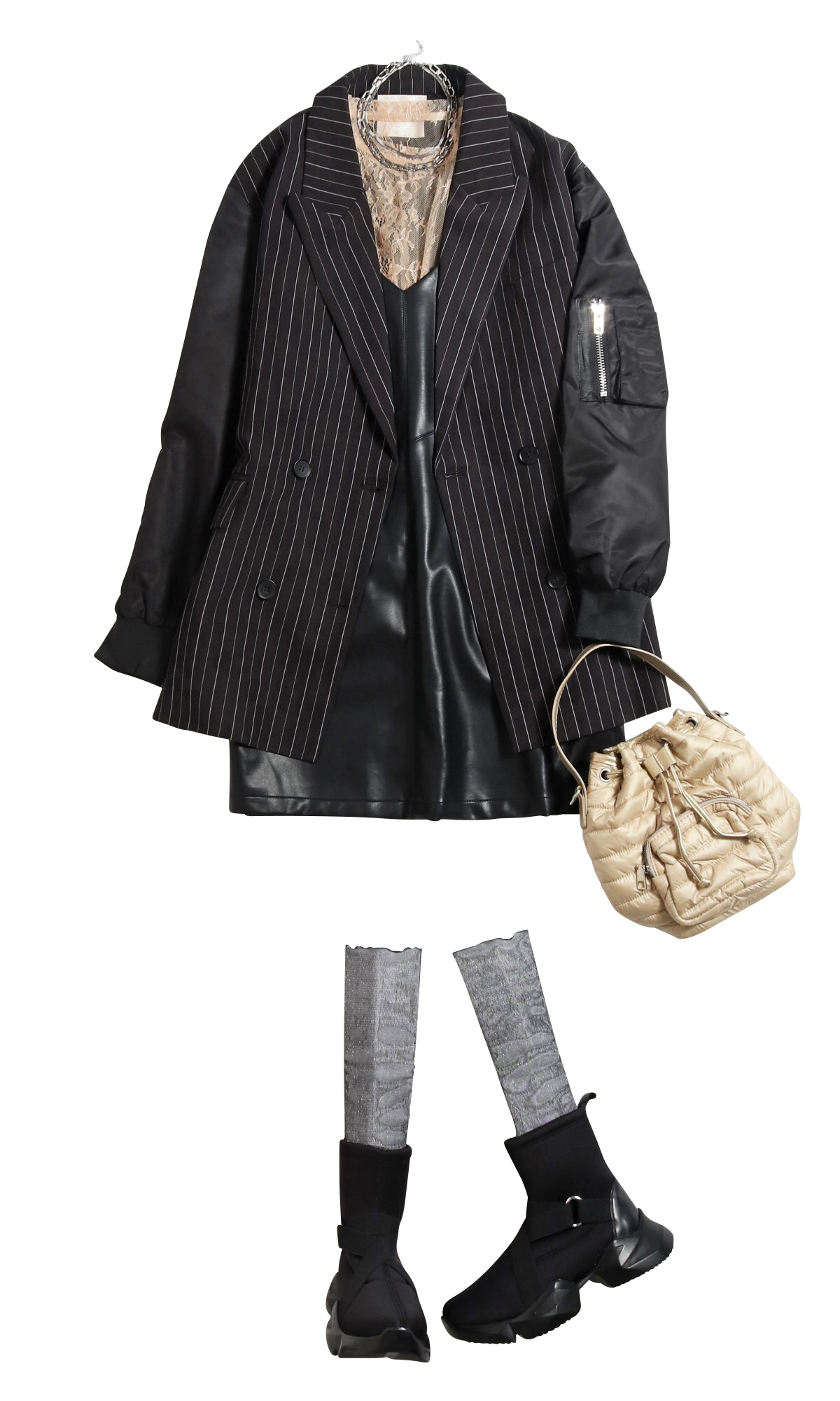 センシュアルなミニワンピをハンサムなジャケットと合わせて強さを出すと、フェミニンさが軽減され硬派なシルエットのモードなコーデへ着地。さらにデザインブーツで辛口仕立てに。