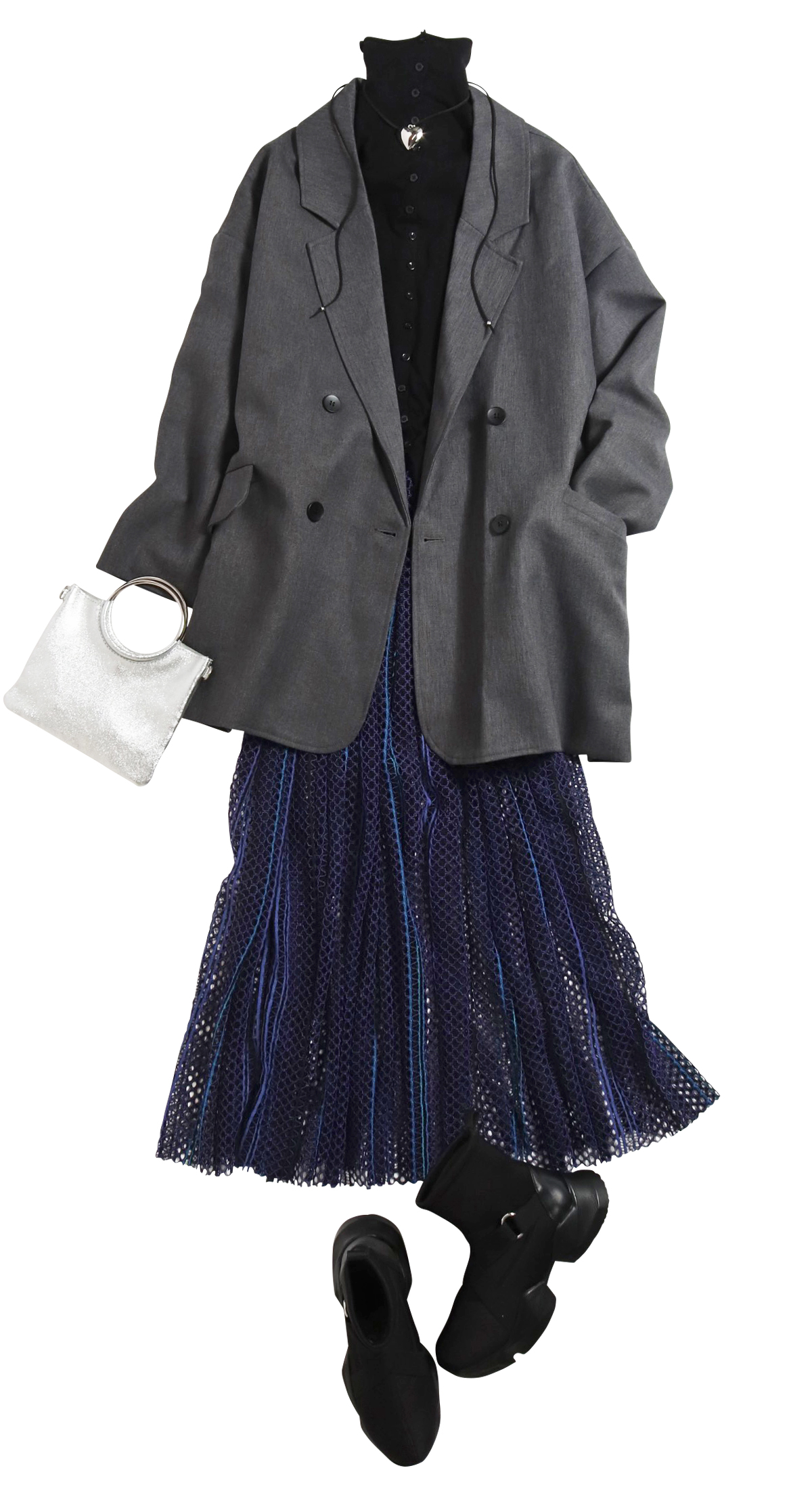 かっちりめのテーラードジャケットにクロシェレースをあえて合わせてレディな「抜け」をプラス。ビッグシルエットならトレンド見えも兼ねてくれる。