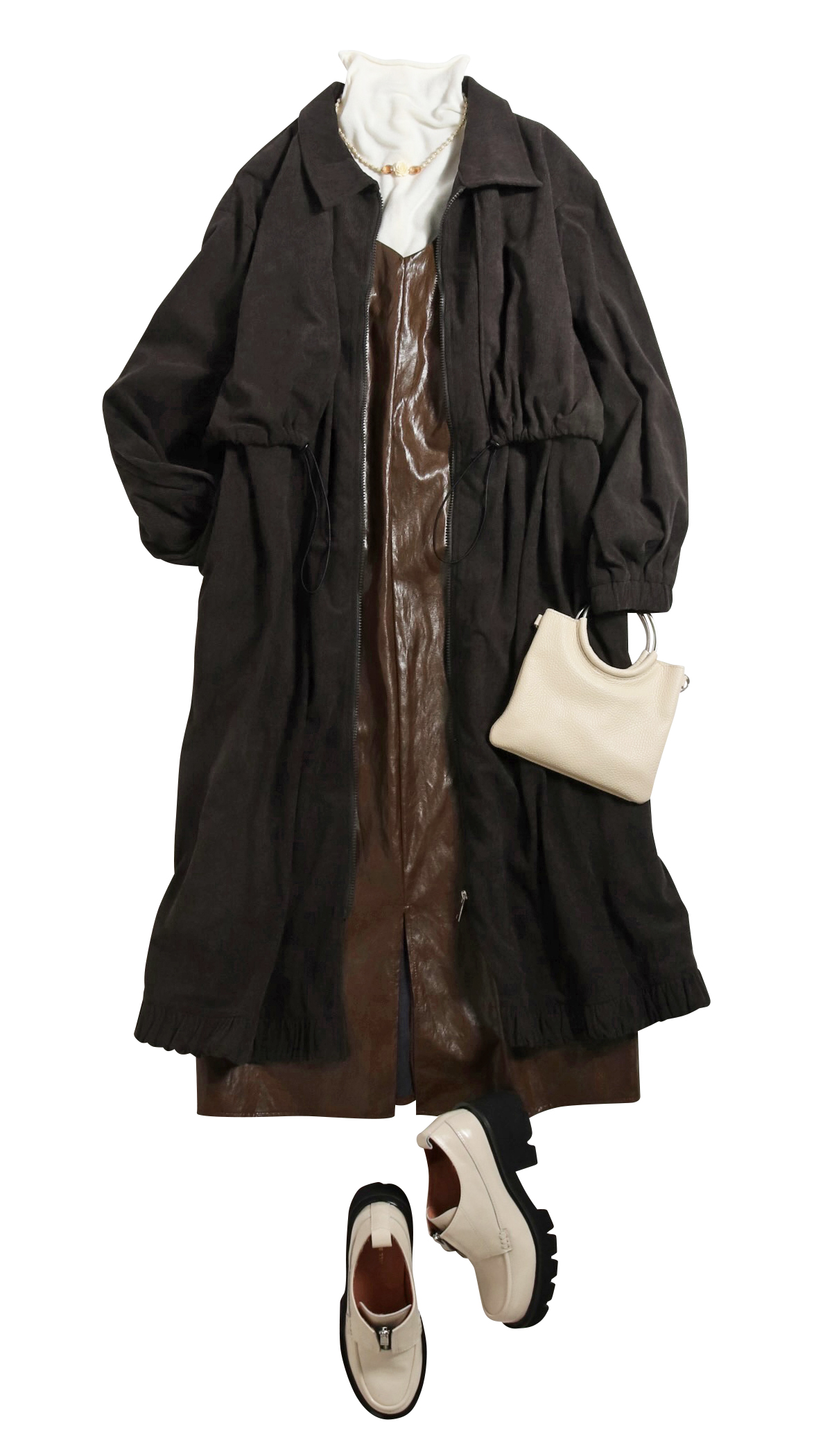 細ウネのコーデュロイでマイルドな印象のロングコートに直線的なレザーライクワンピースを合わせる。素材感のコントラストでメリハリがつき、コーデにシャープな雰囲気を生み出す。