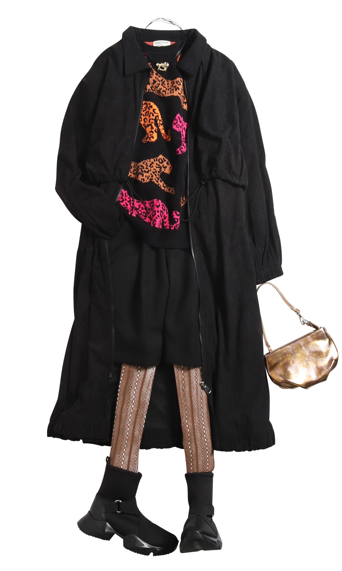 トレンドのミニ丈をロングコートに合わせた新バランスコーデ。ニットで切れ味を効かせ、ブーツやタイツにもアクセントを持たせるとさらに鮮度がUP。