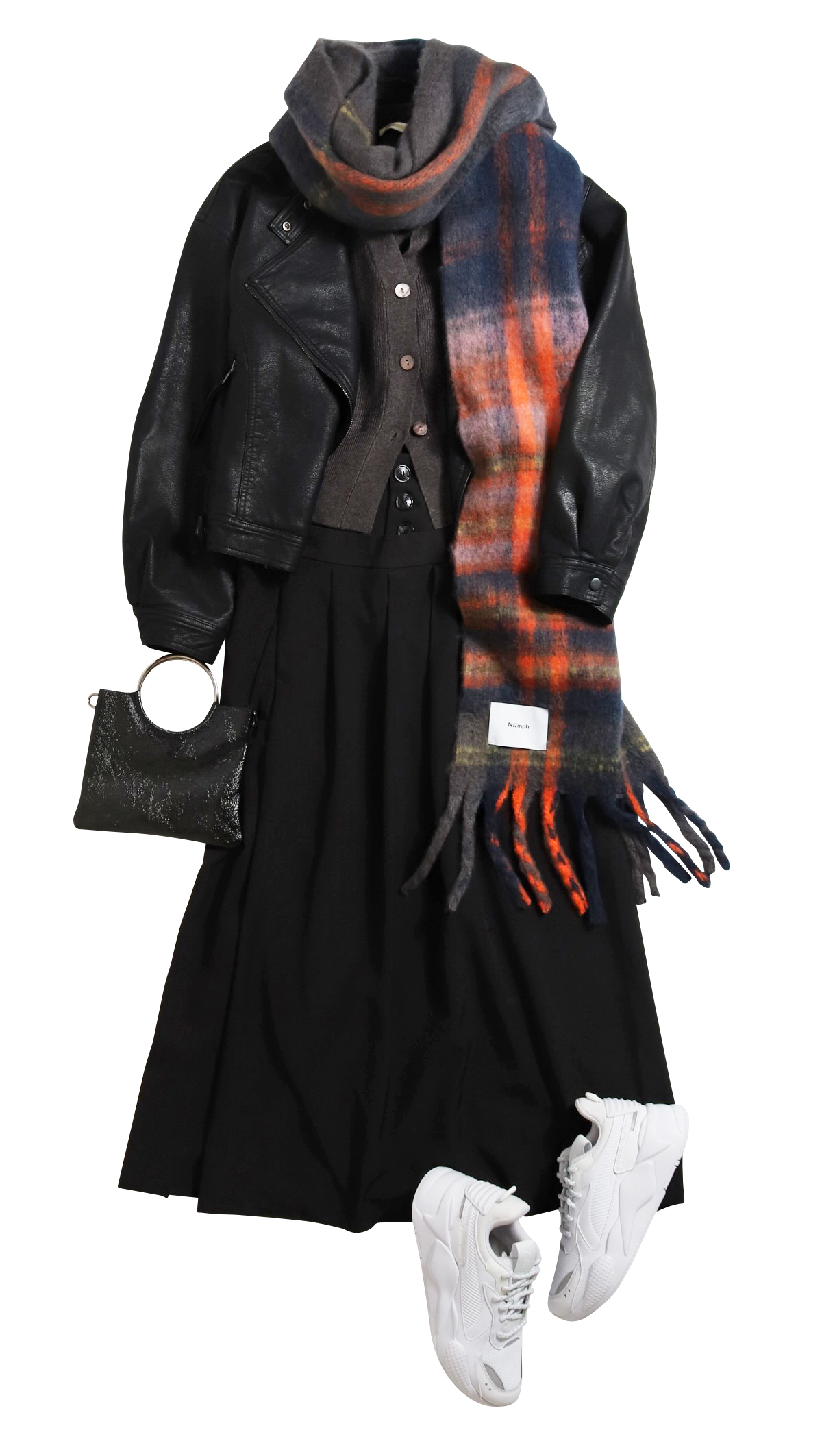 ライダースジャケットと黒のロングスカートを合わせた硬派なコーデ。スニーカーで「スキ」を作り、ハードに傾きがちなブラックレザーの印象を和らげてくれるフワフワのロングマフラーを合わせて中和◎