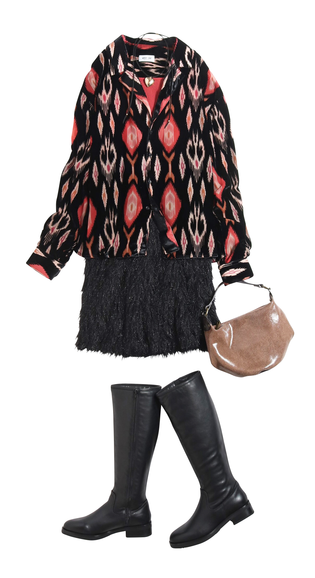 印象的な幾何学模様は「華やかさ」と「こなれ感」を同時に演出できるベロア素材で更新。ブカッとラフに着こなすと◎ 大人っぽく纏めたい時はミニスカxロングブーツがピッタリ。