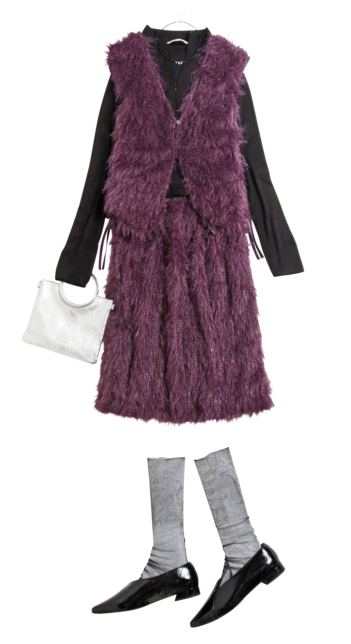 季節先取りのセットアップを上下で揃えたスタイリング。シルエットがコンパクトにまとまり、ファーの存在感がいっそう引き立ちます。テクニック要らずにオシャレを獲得できるコーディネート。