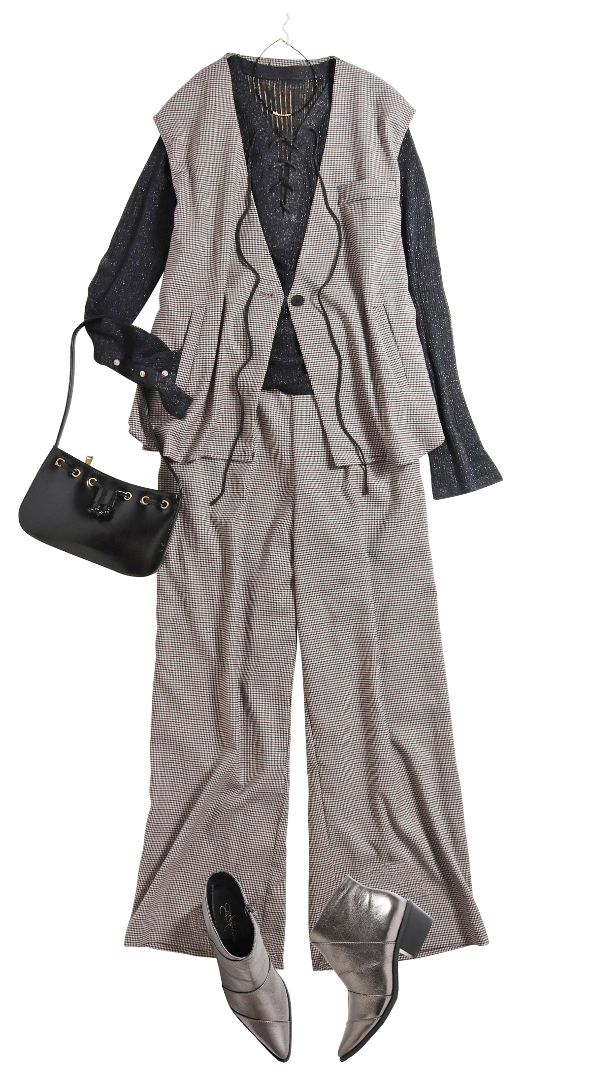 端正なスーチングデザインのセットアップの印象はそのままに、チェック柄とゆとりのあるシルエットで真面目さを軽減。エフォートレスなレースアップデザインのインナーを合わせて「大人の抜け感」を意識したコーデ。