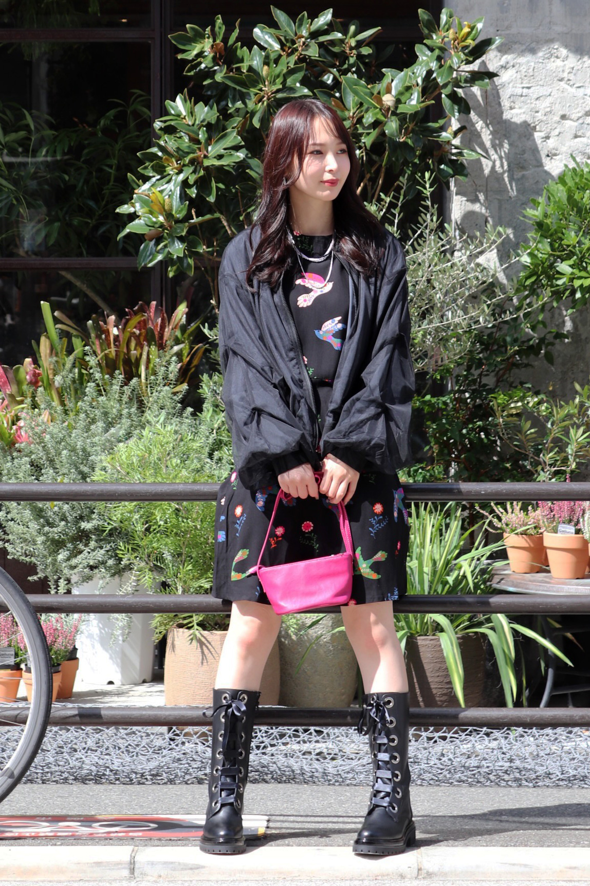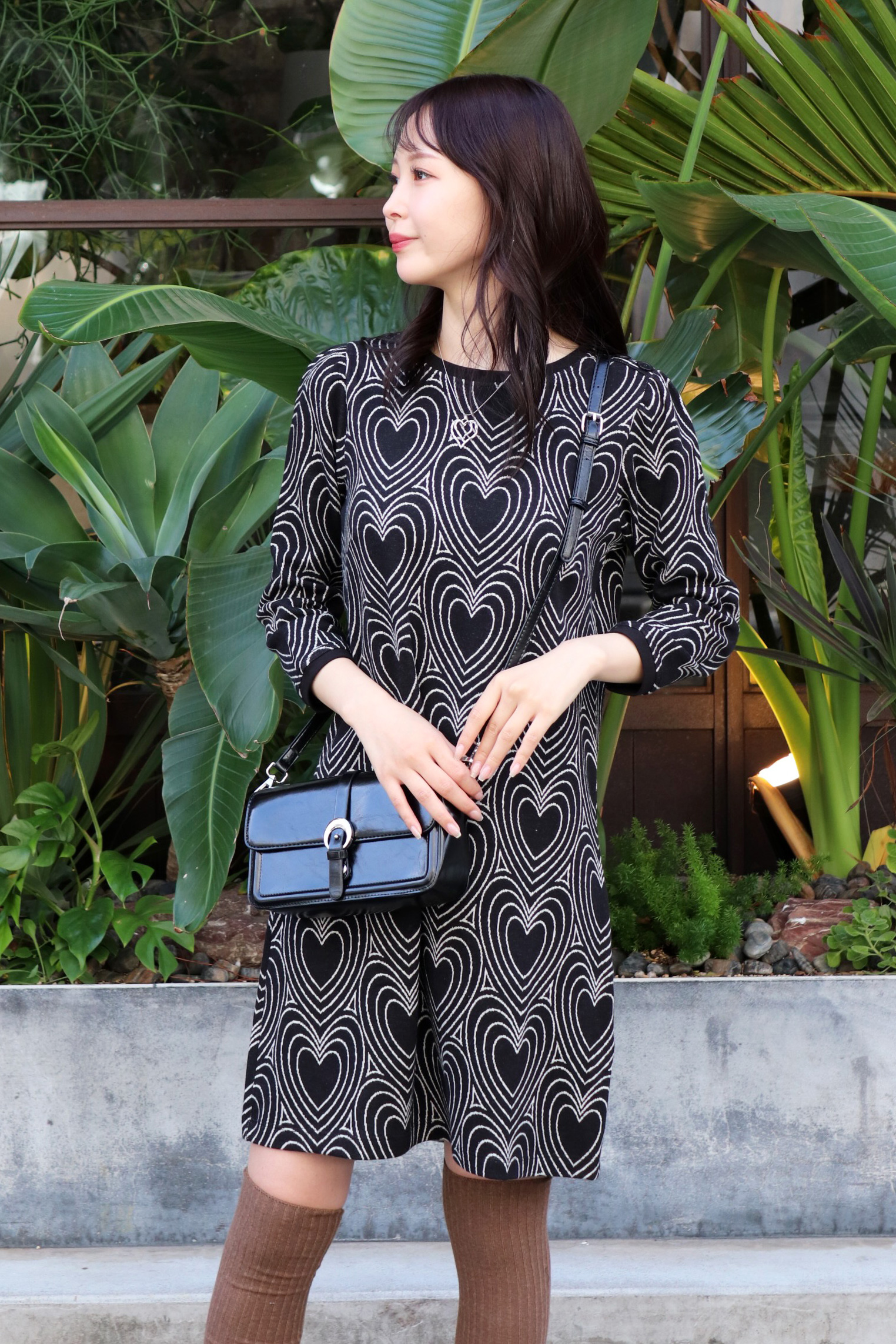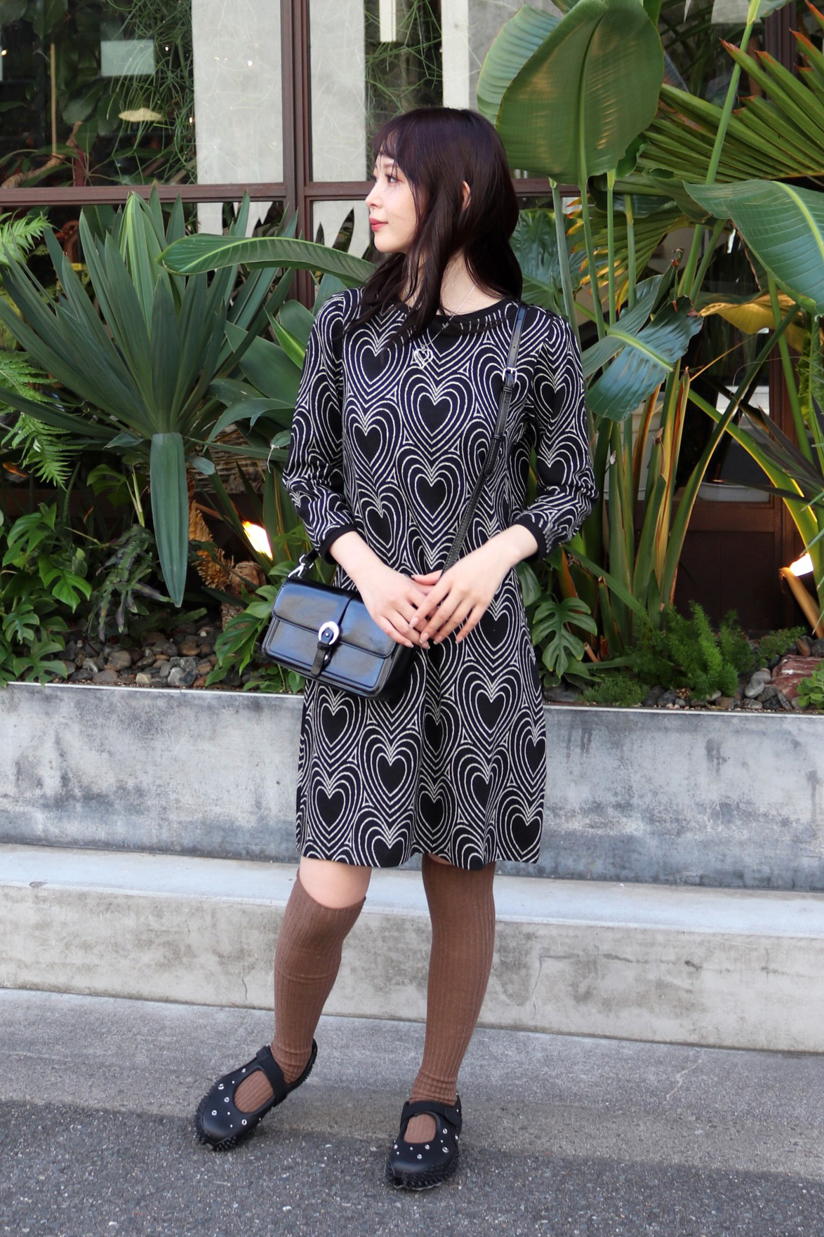 STYLING POINTフェミニンンに傾きがちなニットワンピースはアイキャッチーなジャガード柄で気分転換。ハイソックスとエッジィなシューズで大人でも試しやすい適度な個性に。