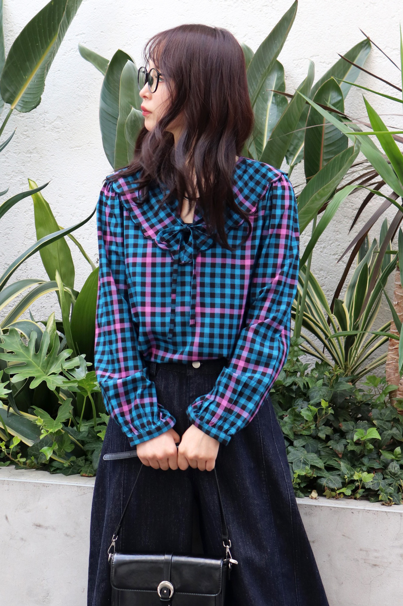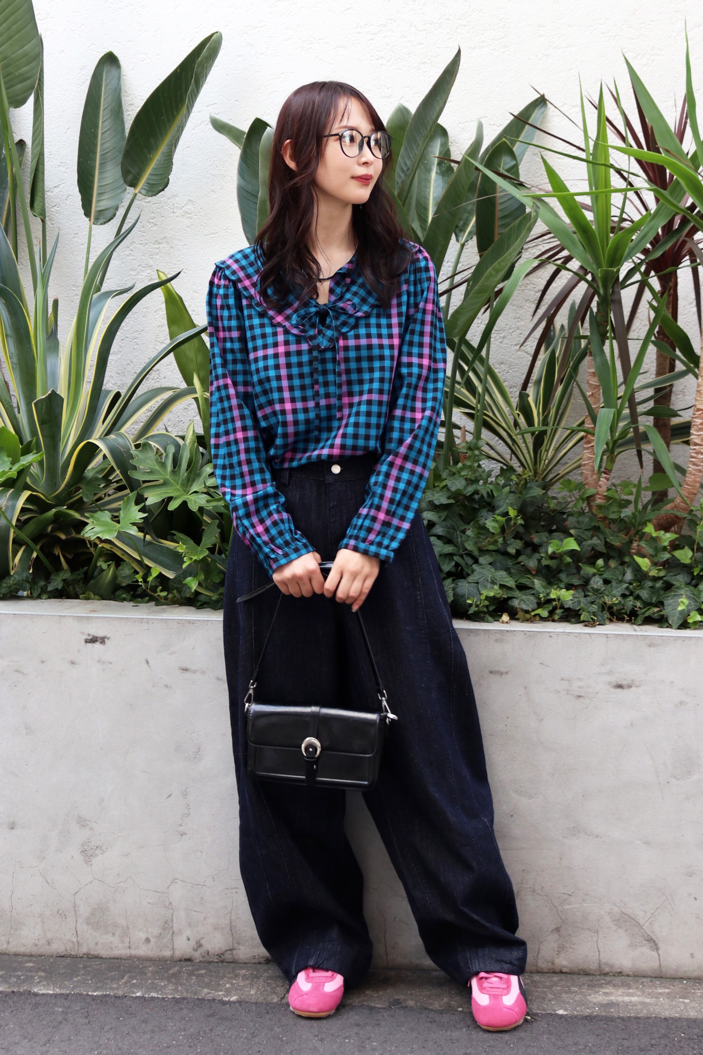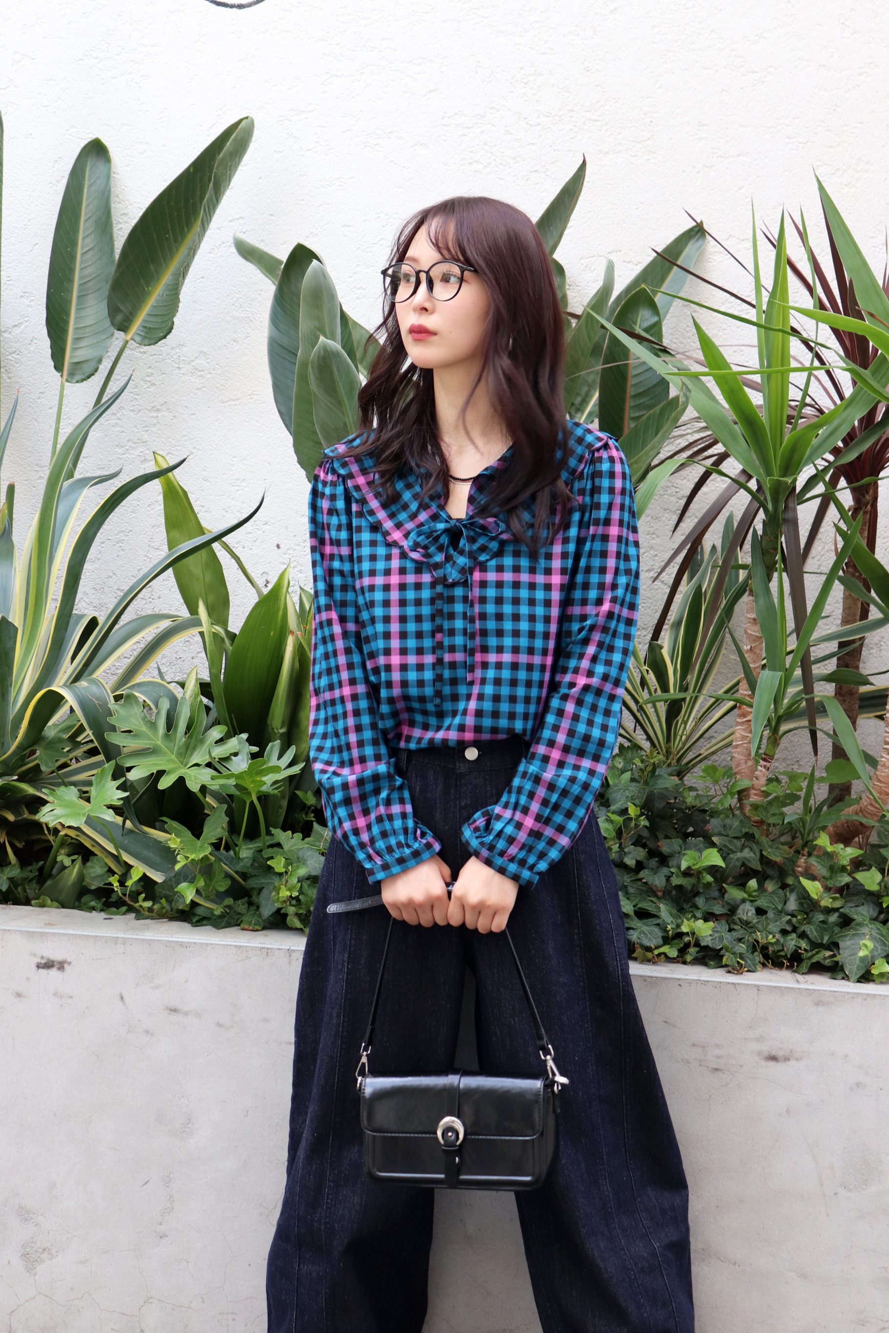 STYLING POINTアクセントの効いたチェック柄の華やかな印象は保ちつつ、落ち着いた雰囲気に纏めるならインディゴデニムがおススメ。ピンクが更に効いてレディライクに。