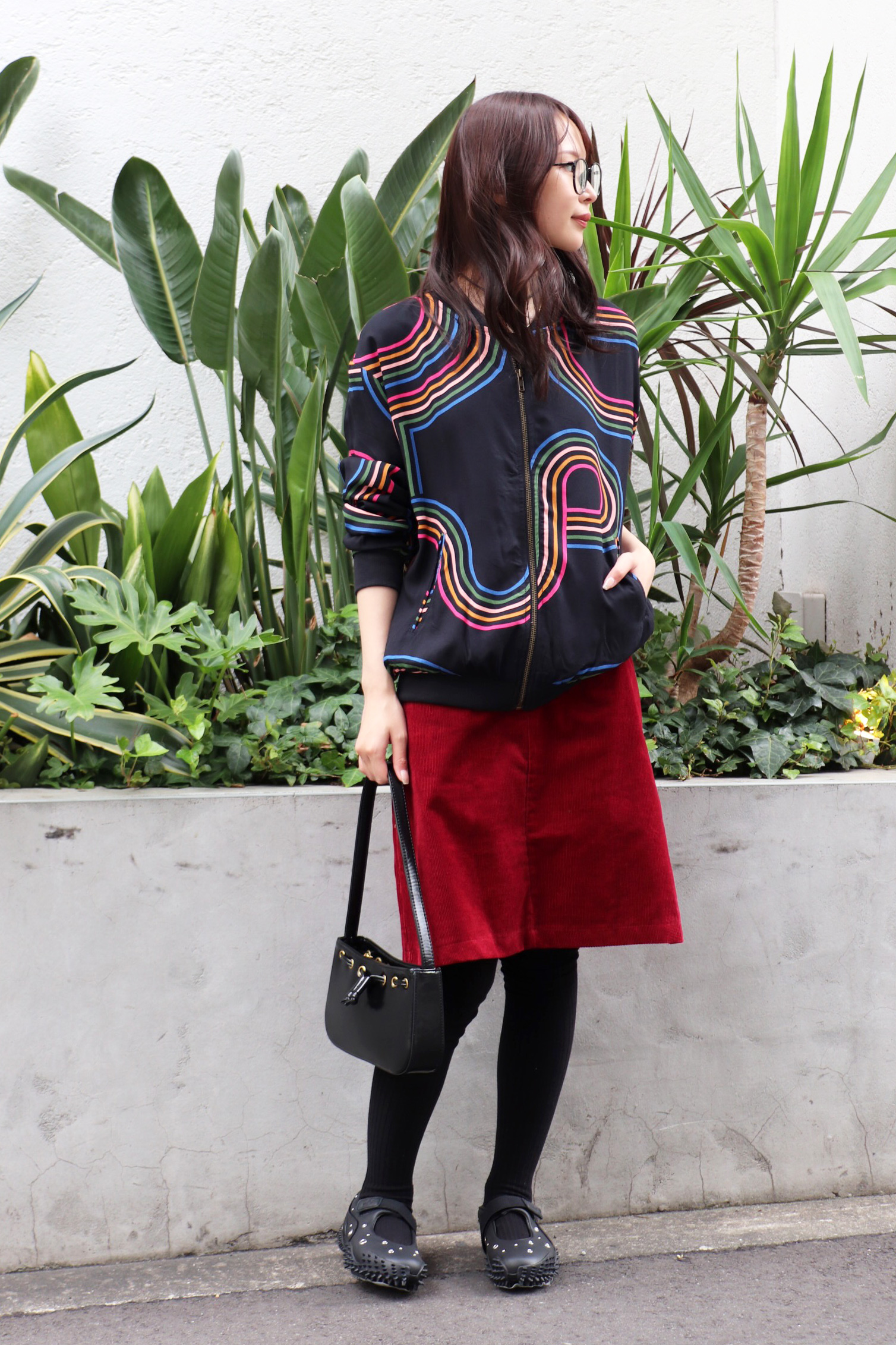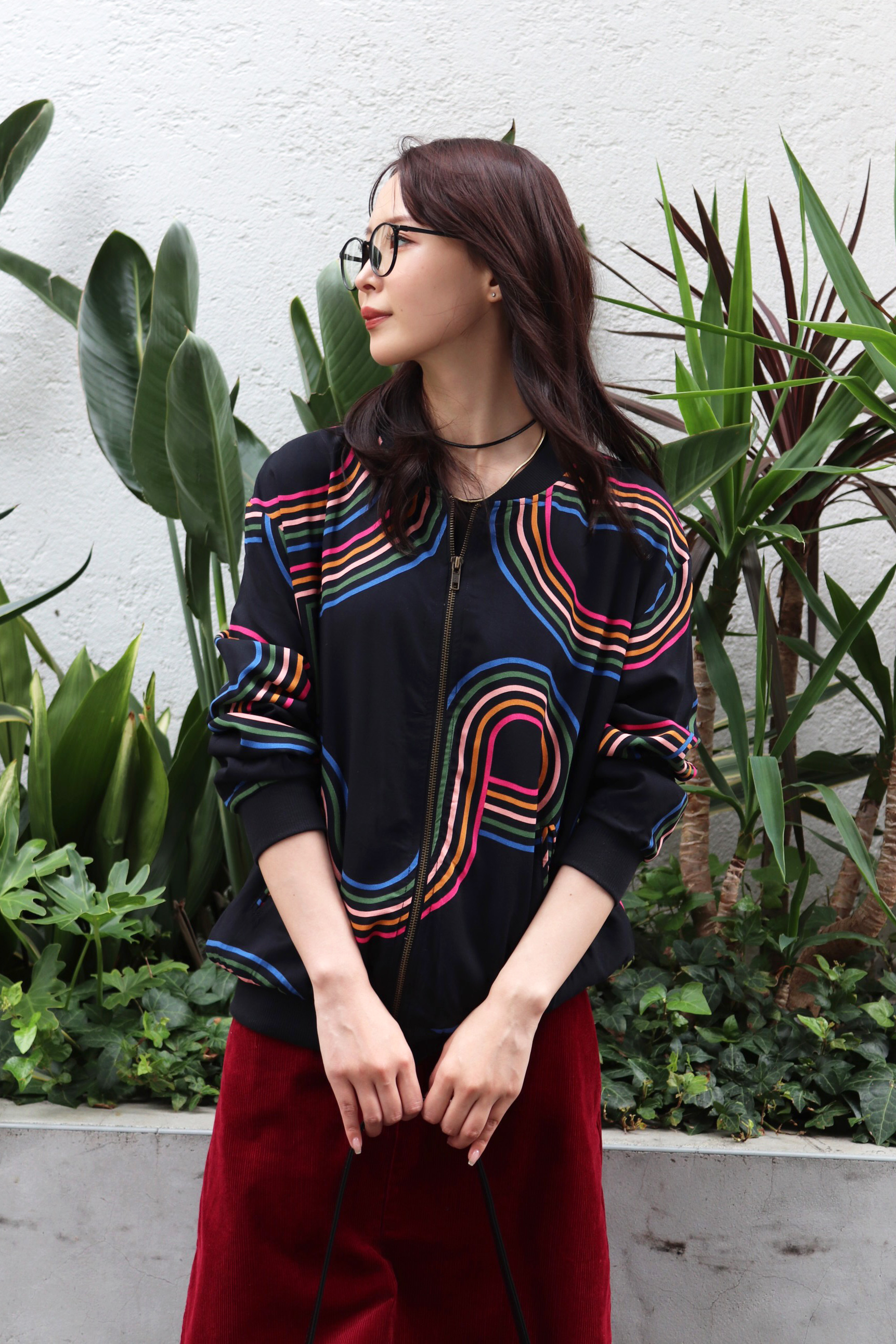 STYLING POINT幾何学模様のプリントが遊び心のあるジップブルゾン。コーデに抜け感を足してくれるコーデュロイのスカートを合わせて、ヴィンテージ感のあるスタイリングに仕上げるのも狙い目。