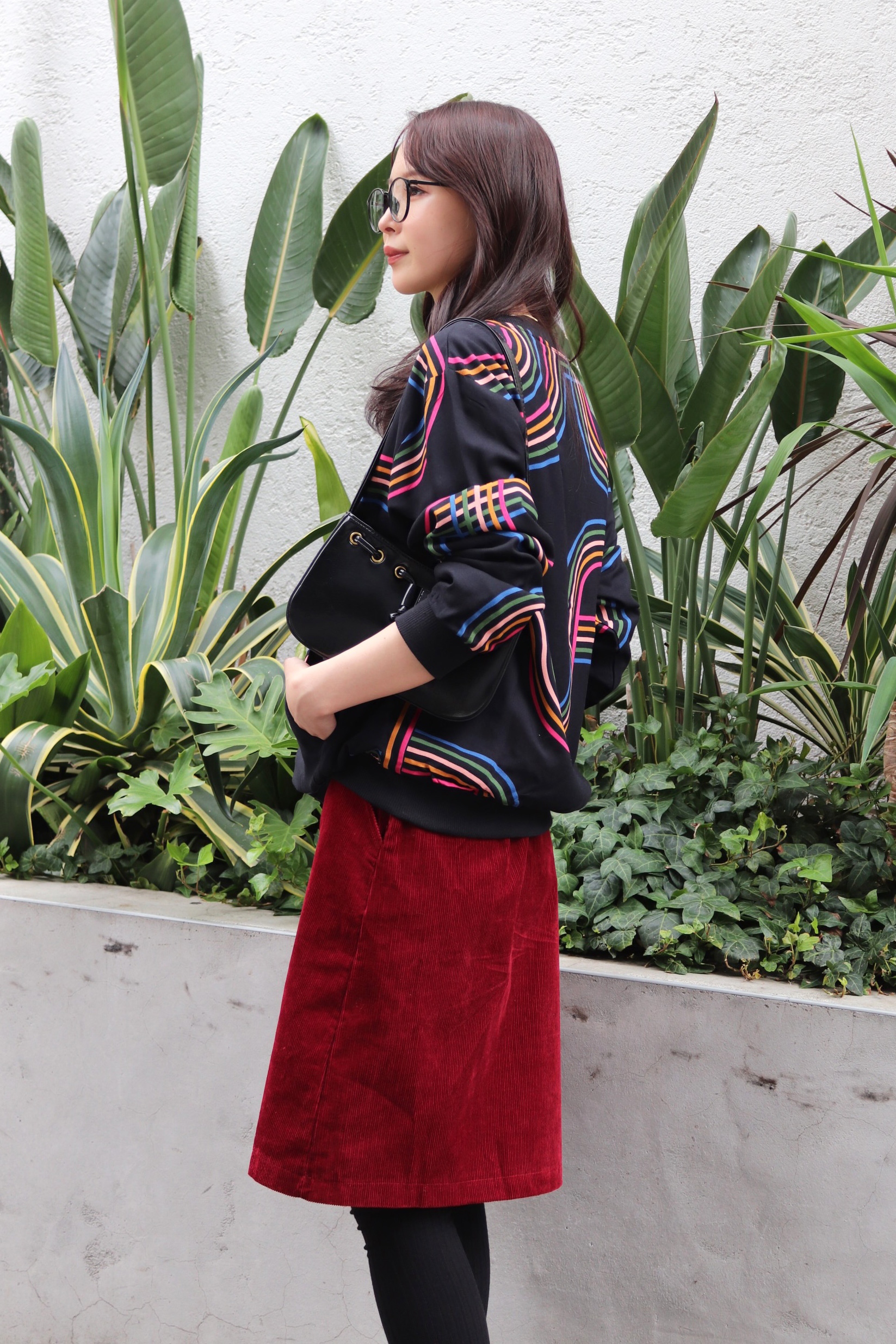 STYLING POINT古着のような懐かしいムードの柄もニットになると愛らしさがプラスされるメリット。それを活かしてガーリーなコーデに仕上げる