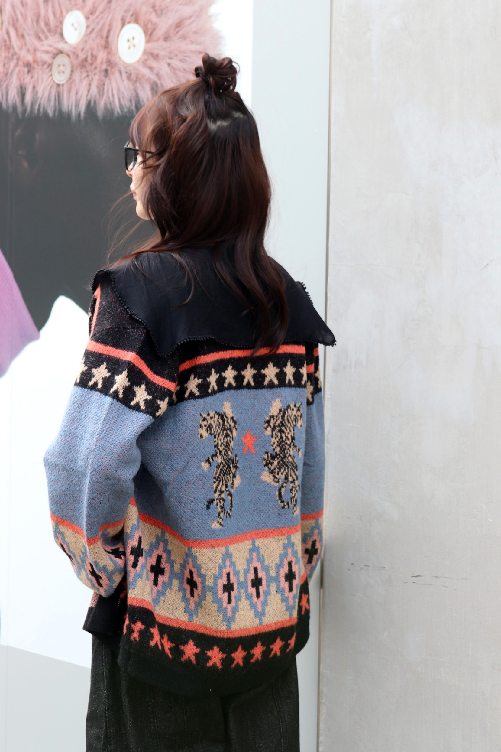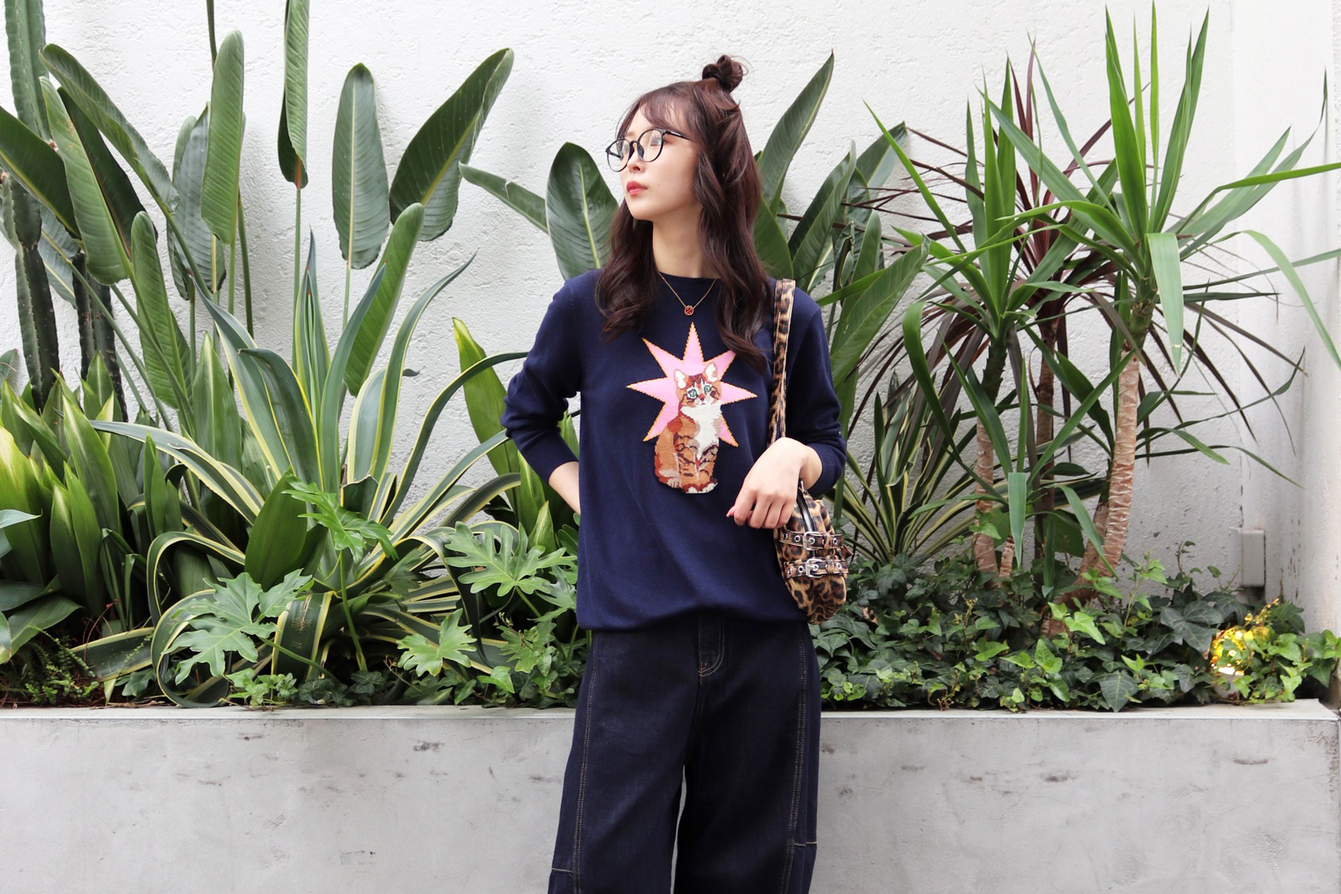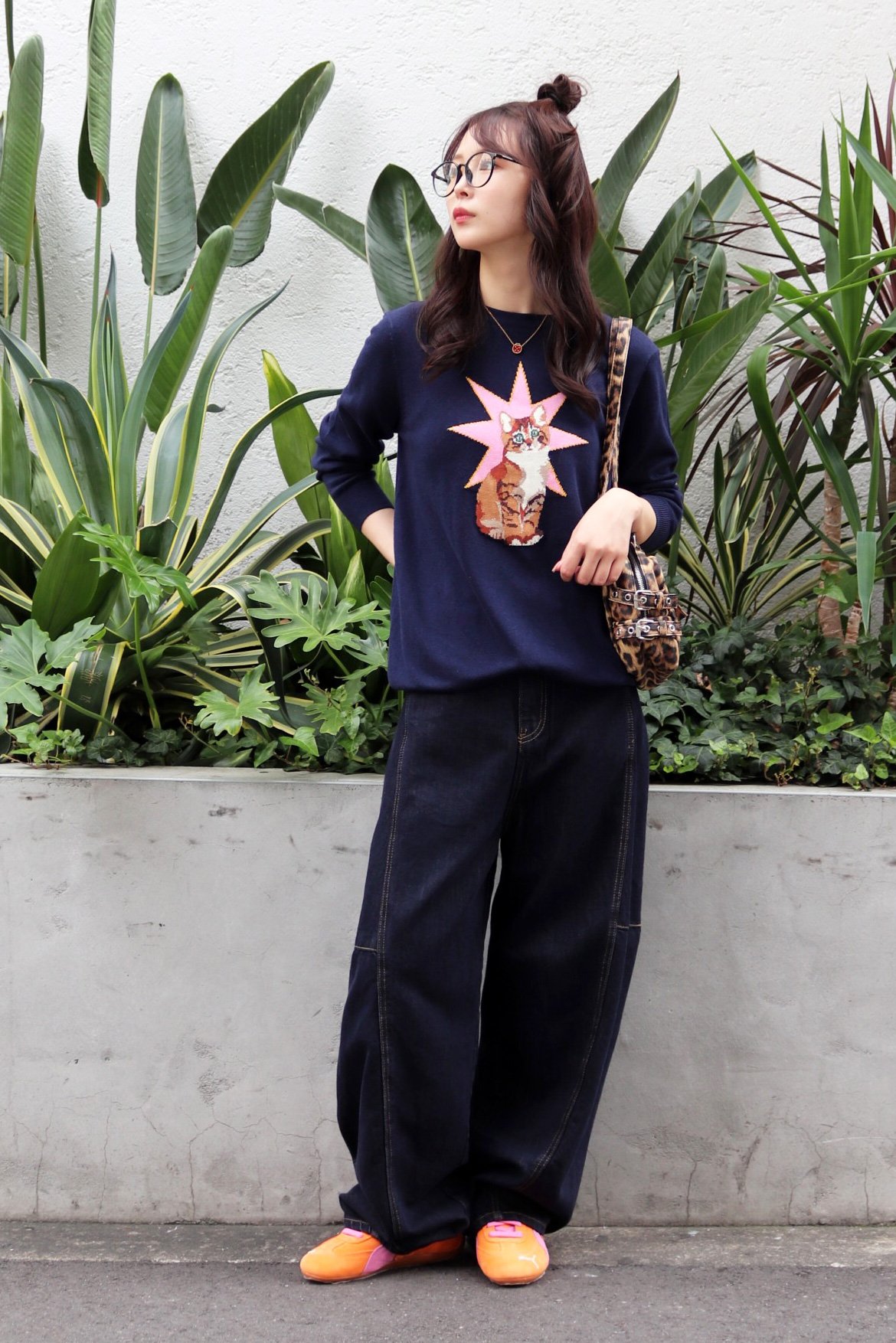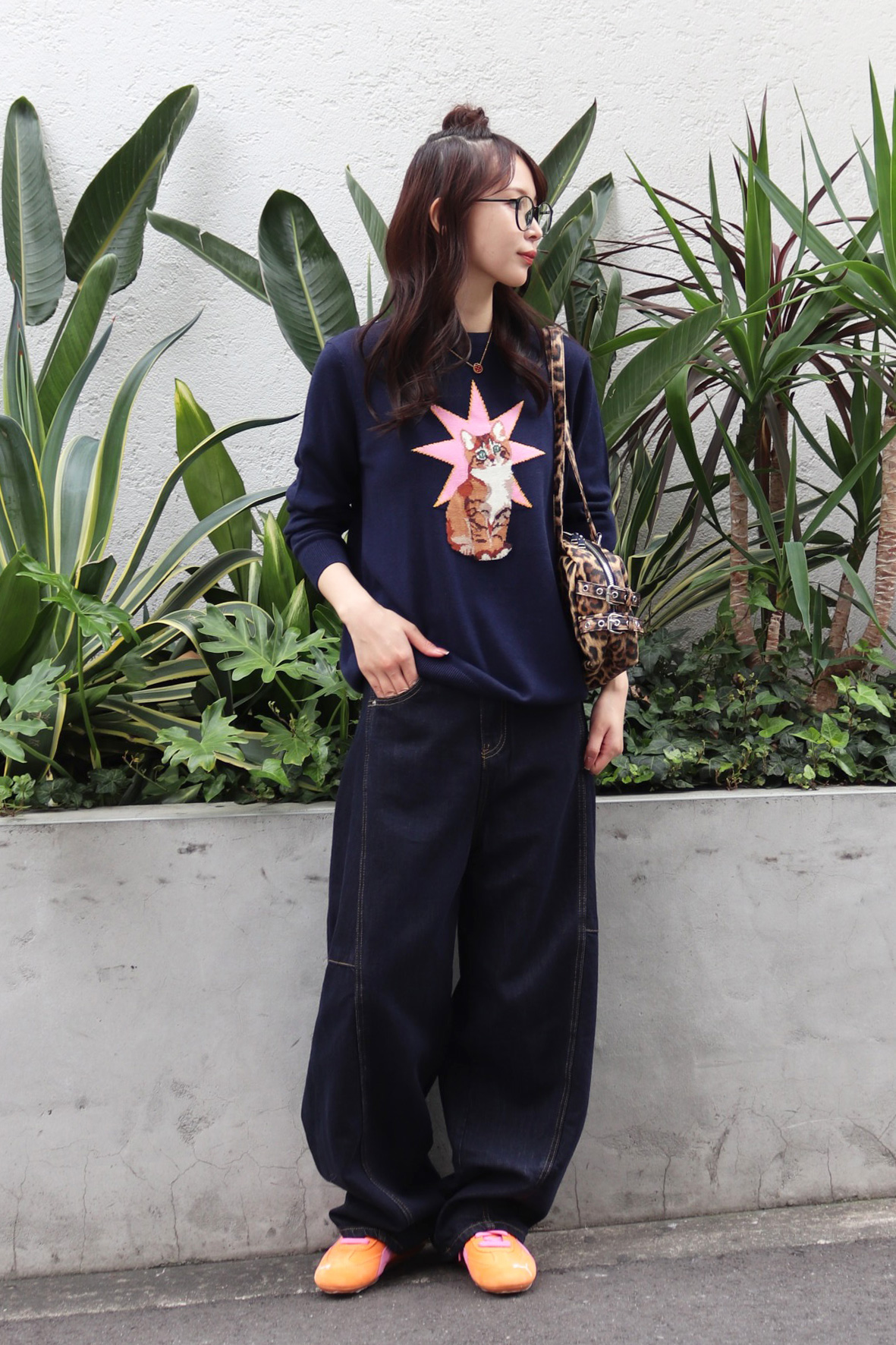 STYLING POINT愛嬌のあるネコが主役級のニットにバルーンシルエットのデニムをチョイス。ニットのテンションに合わせて着方もカジュアルに振り、個性を存分に発揮。