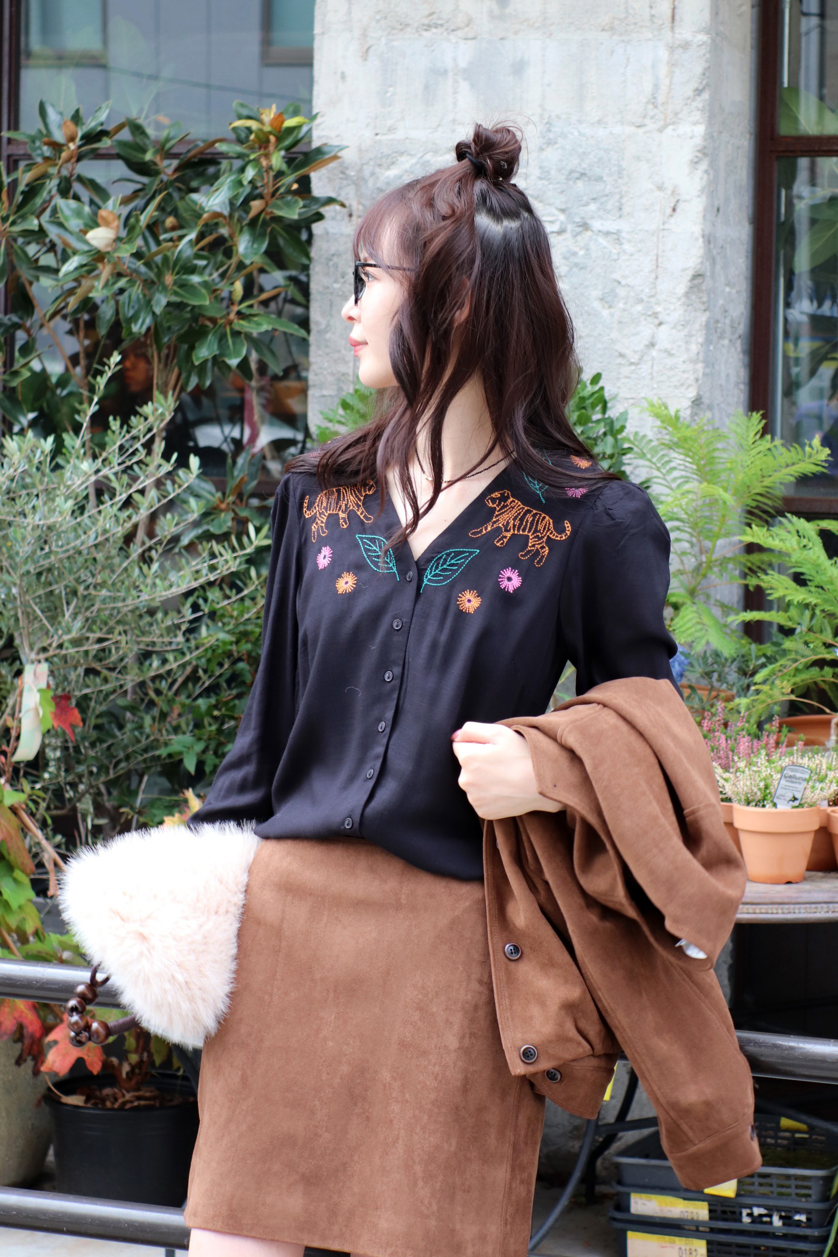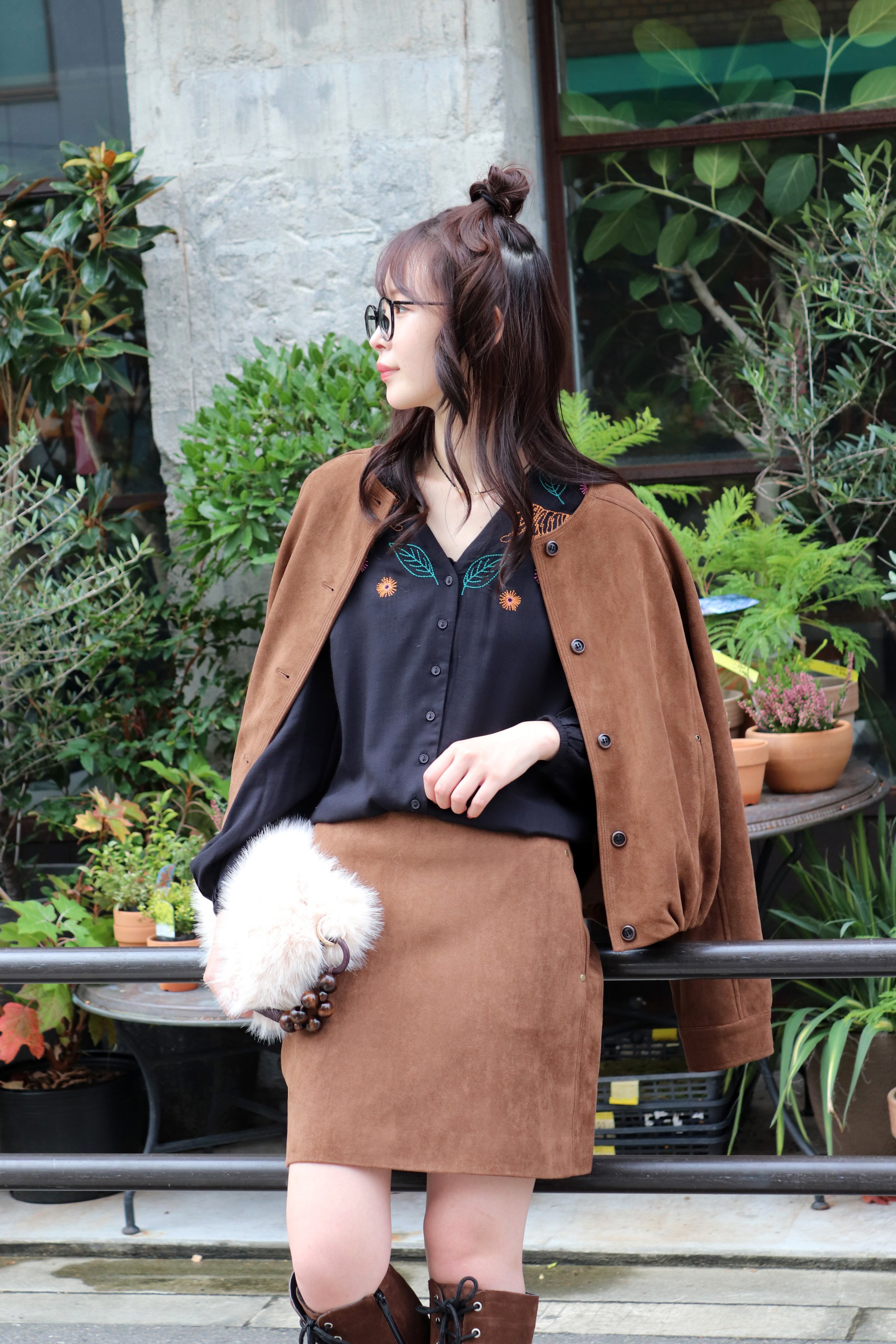 STYLING POINTCUTEな刺繍ブラウスの穏やかな印象はそのままにコーデの格上げを図るなら、スウェード調のクラシカルなセットアップを取り入れてみるのも◎